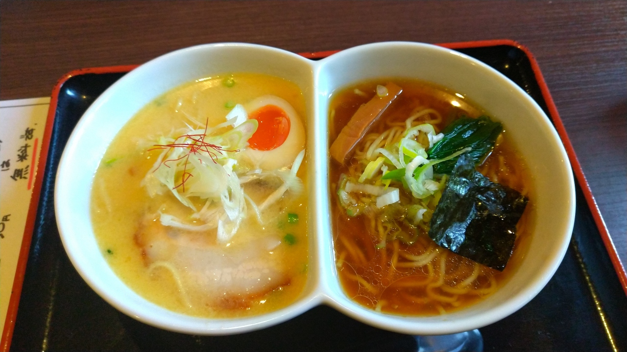 取り出しはコクのある濃厚スープ、醤油は昔ながらのあっさり系でした。半ラーメンずつ2つの味が食べれるのは、ちょっと得した気分です。- 旅行時期