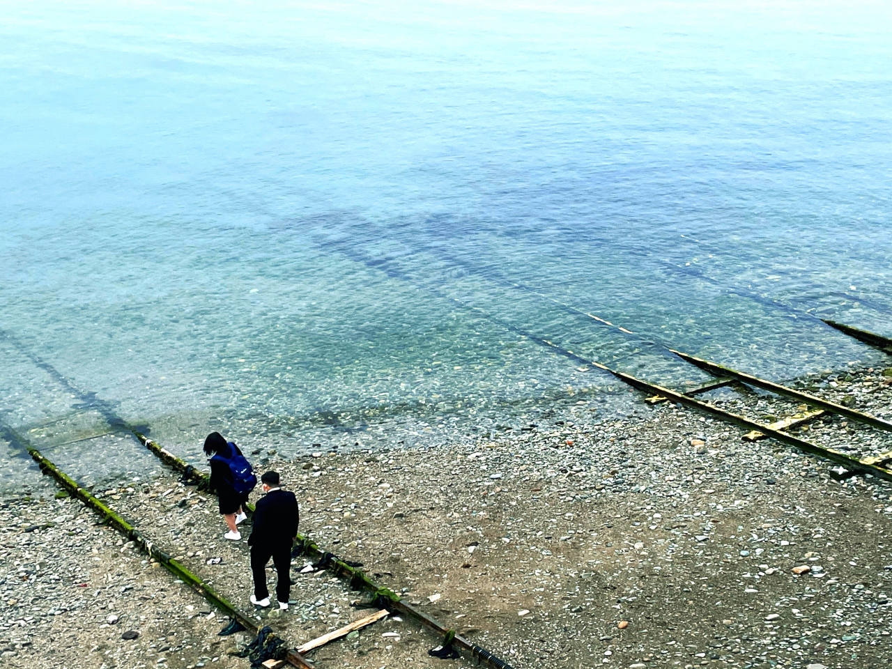 場所は、しもなだ運動公園付近。橋の下に広がる海岸に、海に向かって線路が伸びています。なんとも不思議な風景ですが、種を明かすと、この線路は橋の下にある「造船所」から伸びているんです。