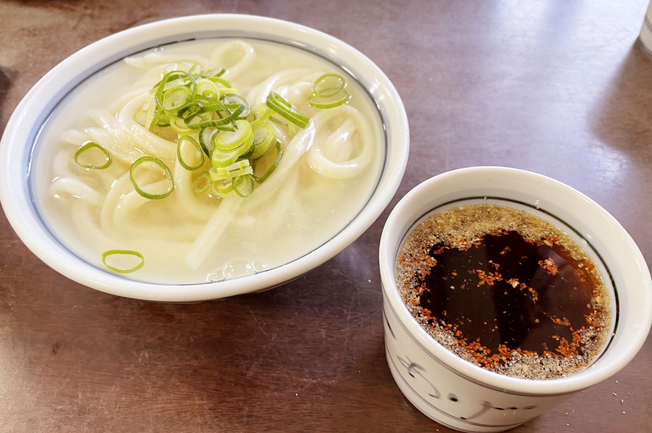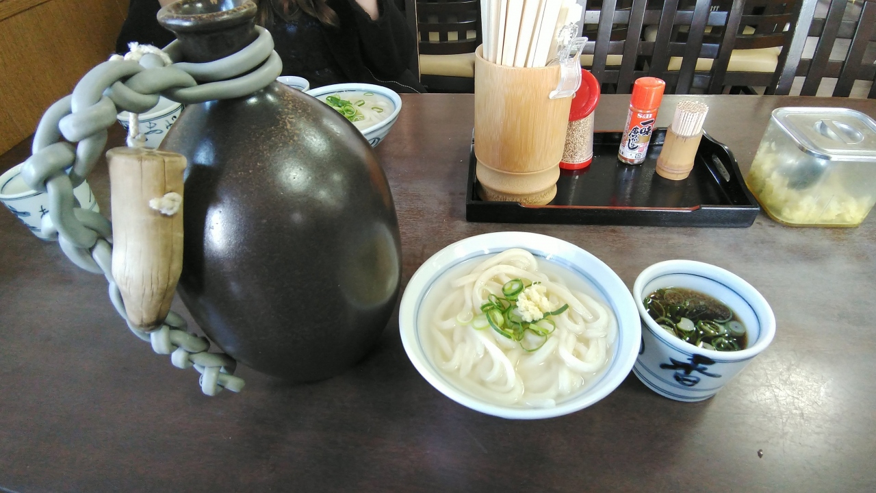 善通寺市にある釜揚げうどんの老舗。もちろん、釜揚げうどんをいただきました。うどんと一緒につゆが入った徳利が出てくるのですが、その大きさにびっくり!