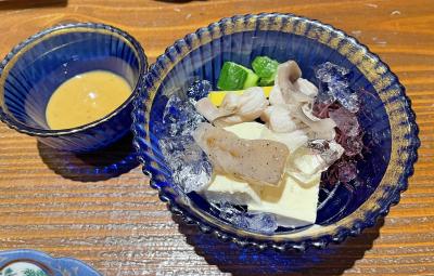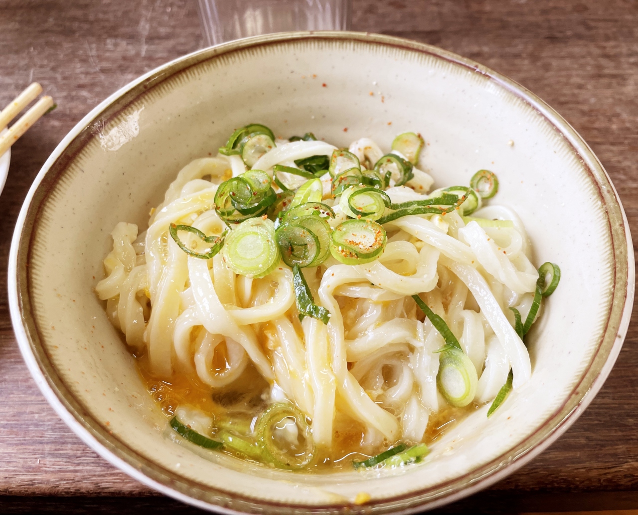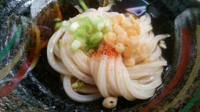ここのうどんは、コシよりモチモチ加減が優るので、冷やしをオーダー。冷たい水の中にうどんが入ってます。ツユも冷たい、いわゆる「ヒヤヒヤ」です。