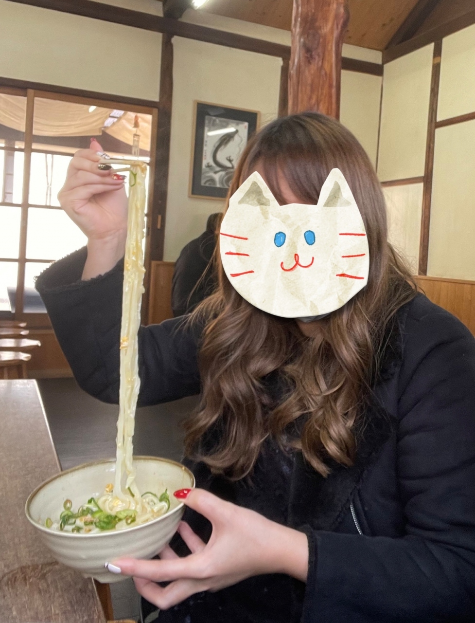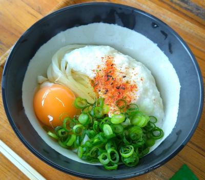 娘は釜玉をオーダー。そっちも、美味しそう!(@´∀`@) しかし、麺が長い!どこまで伸びる!?(笑)- 旅行時期