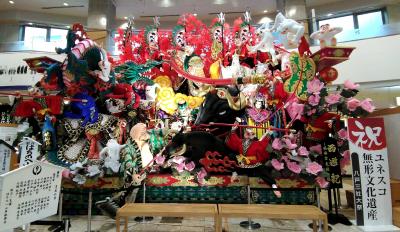 八戸駅近にある「ユートリー」という、ホテルとお土産屋さん&地域の情報センターが一緒になったようなビル。八戸三社大祭の山車が展示されています。山車の大きさにビックリ!ヮ(゚д゚)ォ!大人数で引くそうで、ユネスコの「無形文化遺産」にも指定されているそうです。滑稽な動きで人々を和ませる「虎舞」も展示されていて、虎 に噛まれると無病息災になると信じられているとか。