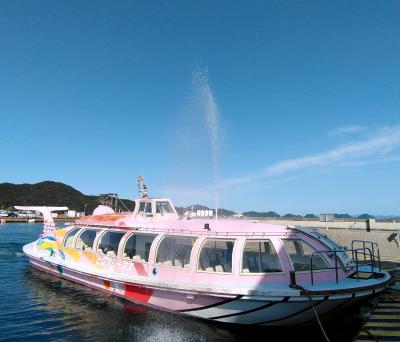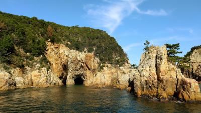 奇岩を海から見学する、青海島を一周する遊覧コースが有名だが、コロナ対策で一周コースは休止中。50~60分のショートコースのみ、海の様子を考慮しながら運行中。訪問時の天気は快晴だったが、外海は波が高いとのことで、一番短い50分コースのみの運行でした。一周する航路と比較するとわずか1/5ほどですが、風光明媚な景色が楽しめました。東山魁夷もこの風景を気に入り、岩と海を題材に絵を描いています。