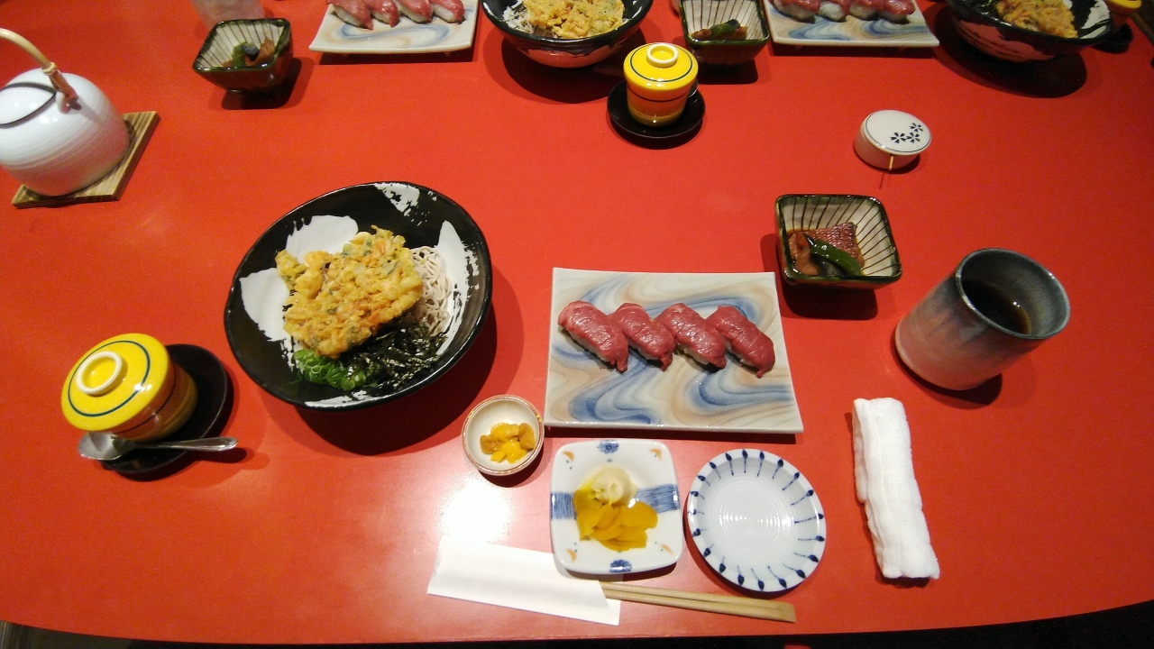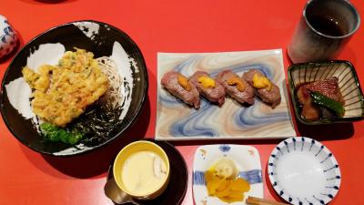 メニューは「黄金のウニが輝く☆あしたか牛炙り寿司と金目鯛の煮付け&桜海老のかき揚げ蕎麦付」でした。牛炙り寿司は、目の前で炙ってくれます。ウニもあしたか牛も、美味でございました♪美味しかったけど、切り身が小さかくて3口で無くなっちゃったのが金目の煮付け。桜えびの揚げ蕎麦は、食べる直前に温かい蕎麦つゆをかける仕様。サクサクのかき揚げが香ばしい♪(?´?`?)見た瞬間は、少ないかな?と思ったけど、意外とお腹いっぱいになりました。- 旅行時期