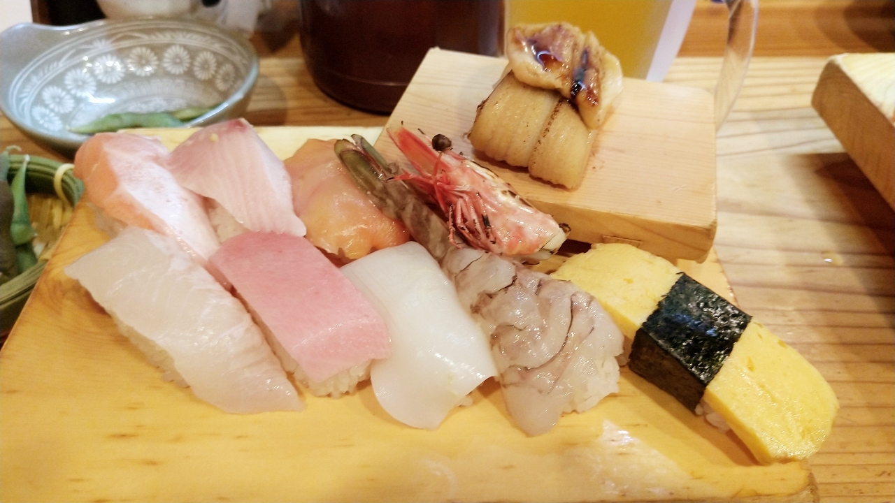 サーモン大トロ・ハマチ大トロ・赤貝・車海老(頭)炙り・極上一本穴子・ヒラメ・本マグロ大トロ・極上ヤリイカ・車海老・タマゴの10貫セット。サクッと飲んで食べて、消費税込¥2035!安っ!メッチャ安っ! しかもネタは新鮮な上に、とろける口溶け♪(๑´ڡ`๑) コスパ最強なので、いつも混んでいますが、並ぶ価値のあるお店です♪(^o^)- 旅行時期