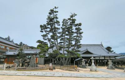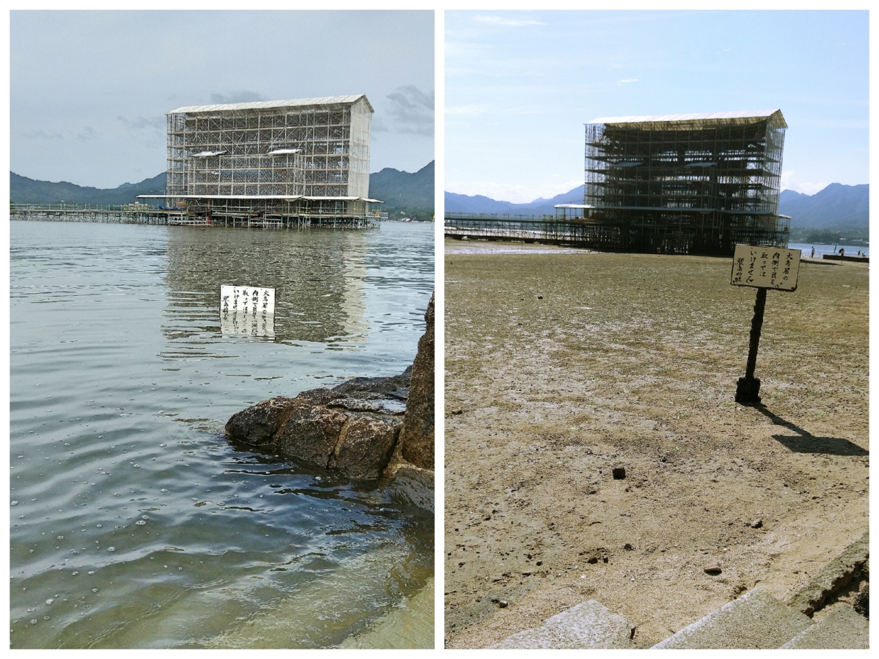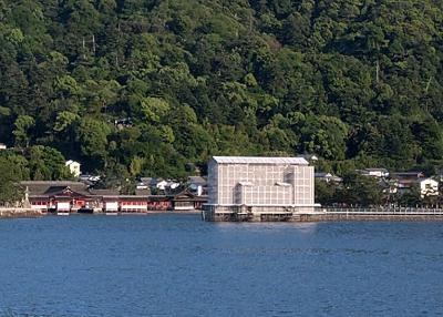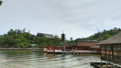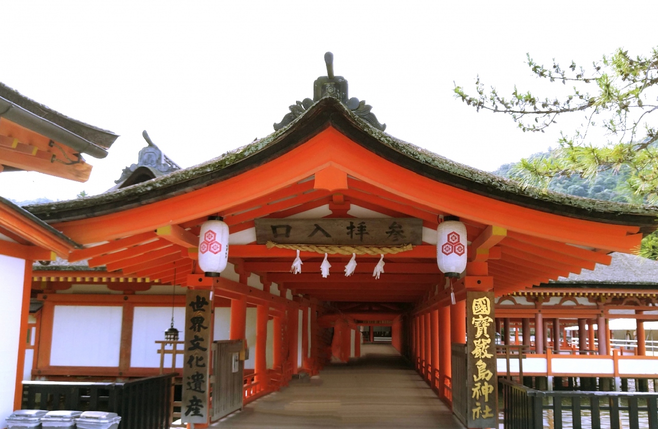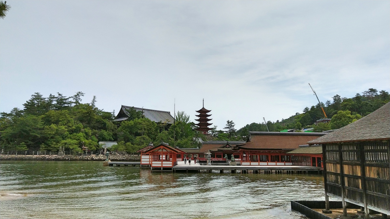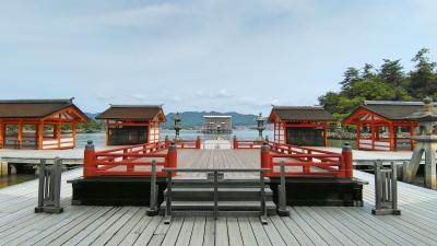 本堂に至るまで、分社や摂社があちこちにあります。満潮時間を狙って渡島したので、海に浮かぶ美しい回廊を見学することができました。中央部分は屋外になっていて、高舞台があります。高舞台の正面には大鳥居が見えます。今はカバーが掛けられていますが、修理が完成したら再訪したいです。反橋を見たり、天神社にお参りしたり、すべてをゆっくり見学すると、なかなか時間がかかるので、しっかり拝観したい方は それなりの時間を取ったほうが良いと思います。- 旅行時期