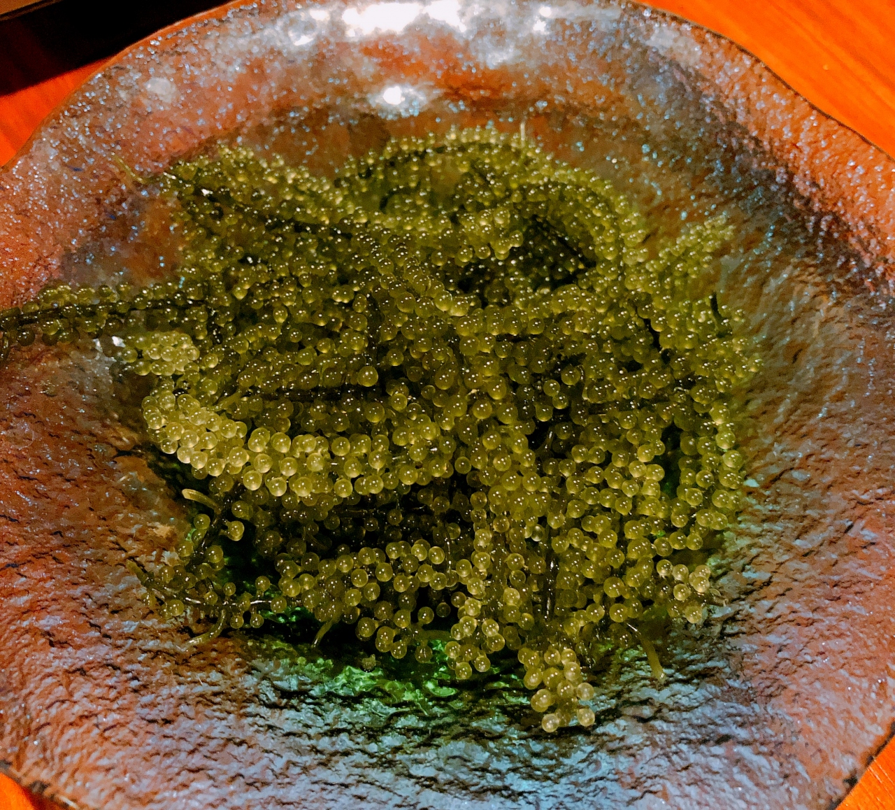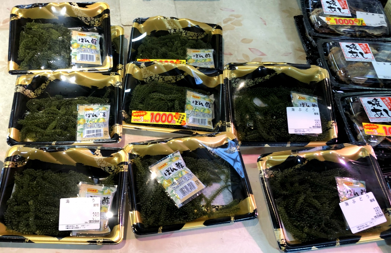 帰りの飛行機までまだ時間があったので、糸満の物産センター「遊食来」(ゆくら)に、お土産を買いにいきました。ここから那覇空港までは、車で15分ほど。野菜やお魚はもちろん、お菓子や軽食も売っています。ここの「てんぷら」が美味しいとのことで、それを目当てに行きましたが、残念ながらおやすみ…(T_T)もう一つのお目当ての生の海ぶどう(3パック¥1000)は、とてもお得に買えました!プチプチ食感がたまりませ~ん!