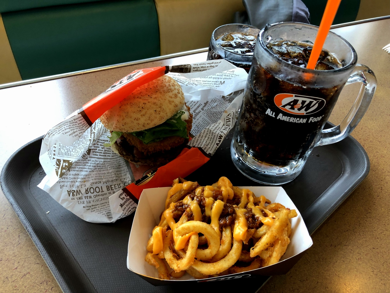 美ら海水族館の帰りに立ち寄り。時間は2時過ぎていたので、店内は空いていました。ハンバーガーは、The A&Wバーガーをオーダー。ビーフ、トマト、レタス、オニオンリングにクリームチーズ!さらに黒糖ペッパーポークまで入ってる豪華版!ホントはビールで、ガッといきたいところだけど、運転があるのでコーラにしました♪サイドメニューに、チリチーズカーリーフライをオーダー。カーリーフライに、スパイシーなチリソースと とろ~りチーズがトッピングされていて これまたウマーでございました♪(๑´ڡ`๑)