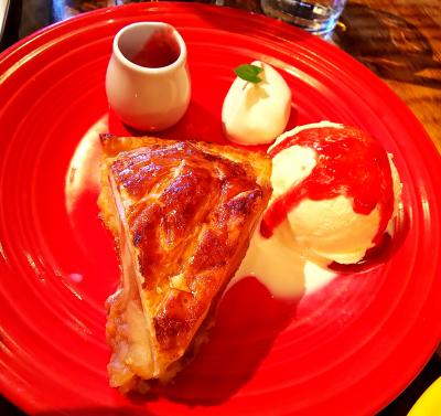 2019/12/)30赤レンガ倉庫内のお店を利用。ちょっと一休みしたいなーと、思ったところでグラニースミス発見!言わずと知れたアップルパイの有名店です!もちろんアップルパイをオーダーしますが、アップルパイだけで4種類あります。どれにしようかさんざん迷って、アーモンドクリームが入った「フレンチダマンド」のアップルパイにバニラアイスのベリーソースがけにしました♪(^o^) パイはサクサク!フィリングはシットリ、アーモンドは香ばしく メッチャ美味しかったー!