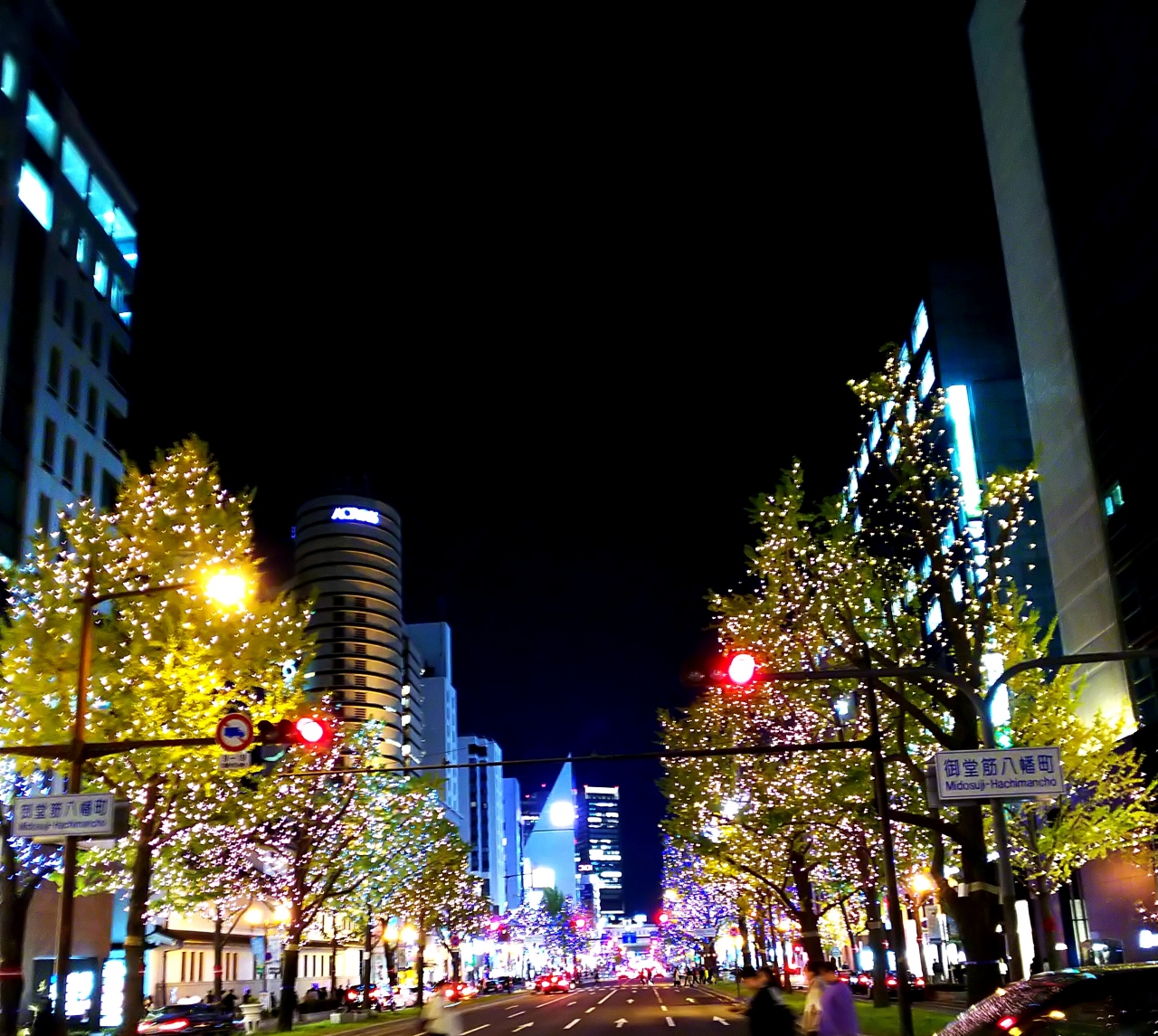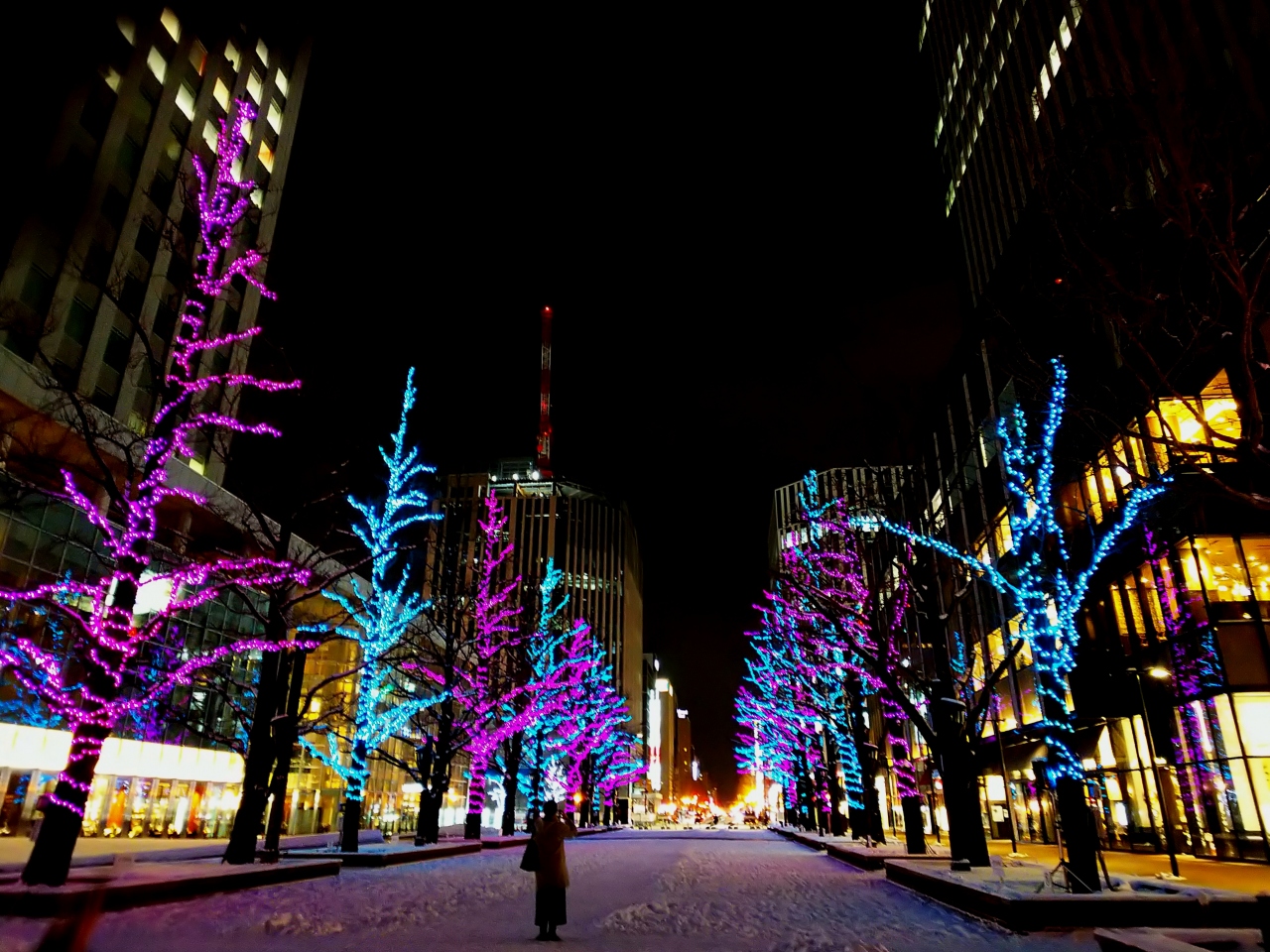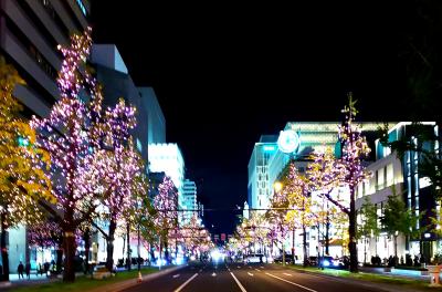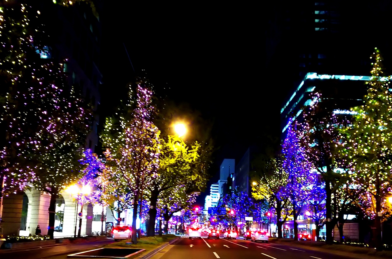 ジンギスカンをたらふく食べて飲んで、ほろよい気分で散歩(笑)雪が積もってるので、結構寒いんですけどね、大通公園でイルミネーションしてるって聞いたので、見に行きます☆(^o^) 道中の街路樹もイルミネーションされててキレイでした。大通公園のイルミは、正式名称「第39回さっぽろホワイトイルミネーション(大通会場)」と言うそうです。点灯期間は、2019年11月22日(金)~12月25日(水)まで。80万球の電飾で、大通西1丁目~大通西6丁目までを彩ります。