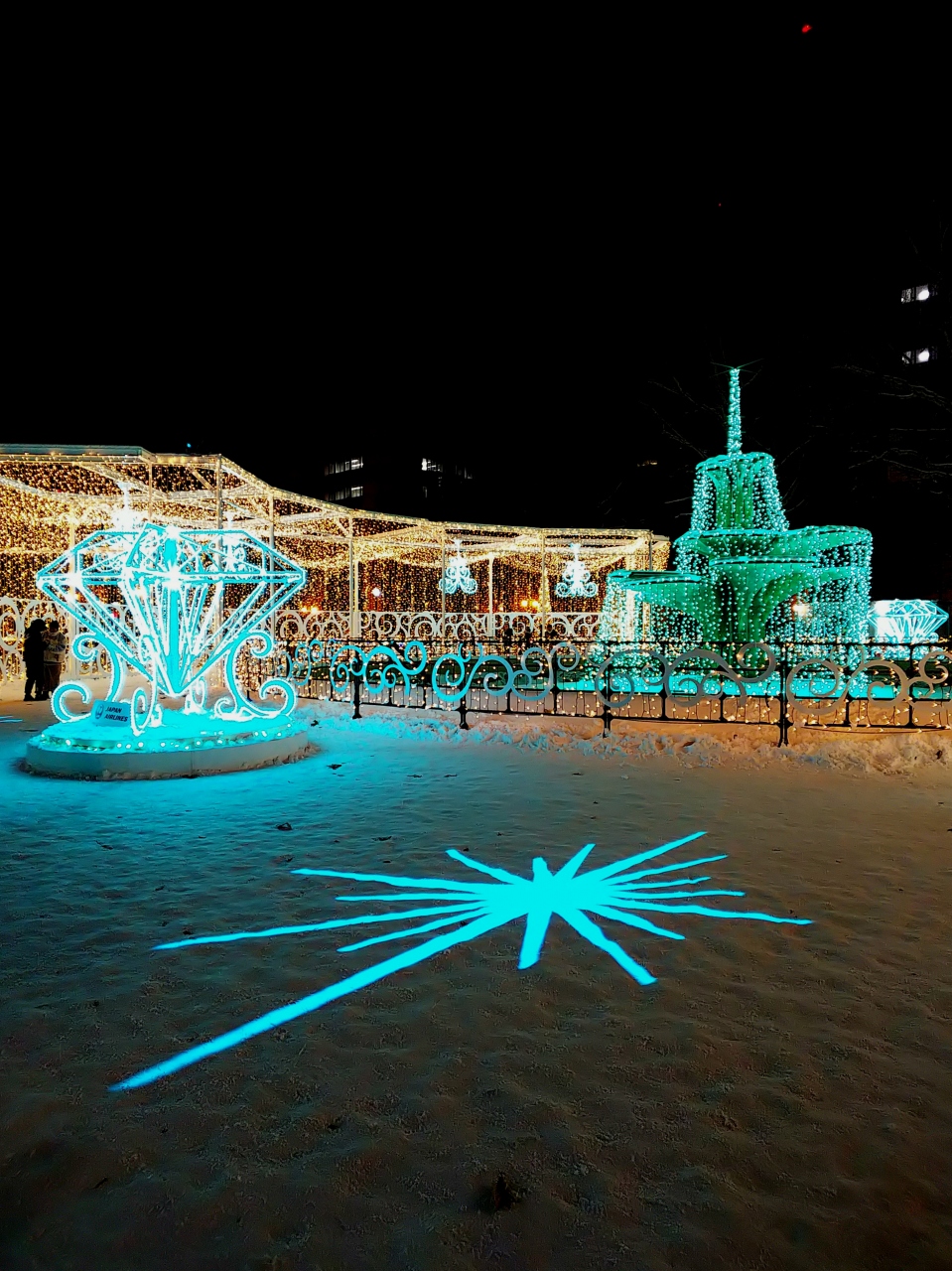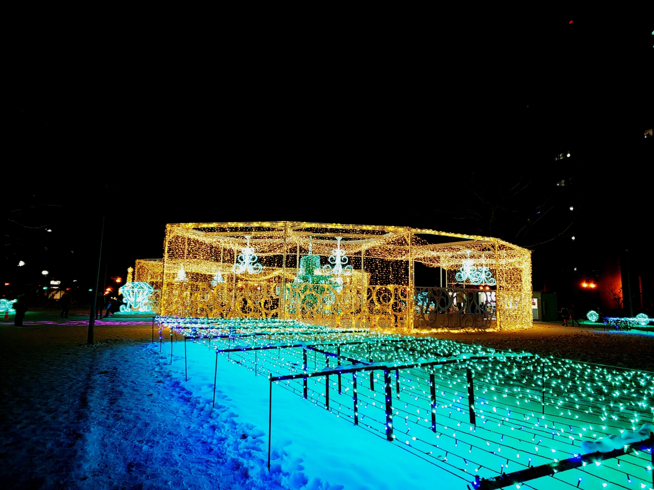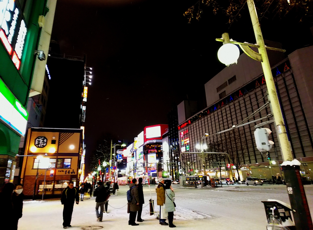 ジンギスカンをたらふく食べて飲んで、ほろよい気分で散歩(笑)雪が積もってるので、結構寒いんですけどね、大通公園でイルミネーションしてるって聞いたので、見に行きます☆(^o^) 道中の街路樹もイルミネーションされててキレイでした。大通公園のイルミは、正式名称「第39回さっぽろホワイトイルミネーション(大通会場)」と言うそうです。点灯期間は、2019年11月22日(金)~12月25日(水)まで。80万球の電飾で、大通西1丁目~大通西6丁目までを彩ります。