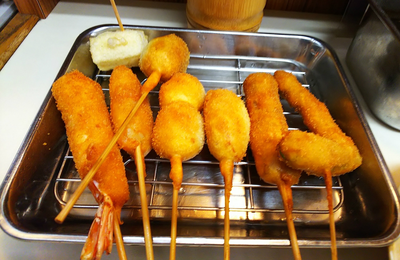 ご存知串カツのチェーン店。串かつ10本とスピードメニュー(どて焼きをオーダー)が1品付いたセットを頼みました。もちろん、ビールも忘れずに♪エビ・豚・アスパラ・うずらの卵・お餅・ウインナー・チーズ、などなど… 揚げたては美味しい!( *´艸`) 女性には、10本セットで丁度いい量でした。
