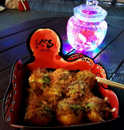 熱々のたこ焼きを、立ち食いでハフハフ食べる!寒い時期のおやつに最高です♪道頓堀通り沿いの本店には、いつも観光客の長い列ができていますが、お堀沿いのお店は空いていることが多く、すぐに食べれます。 お堀を眺めながら座って食べれるテーブル席もあるので、ゆっくり食べたい人は、川沿いに降りてから、お店を探してみて。