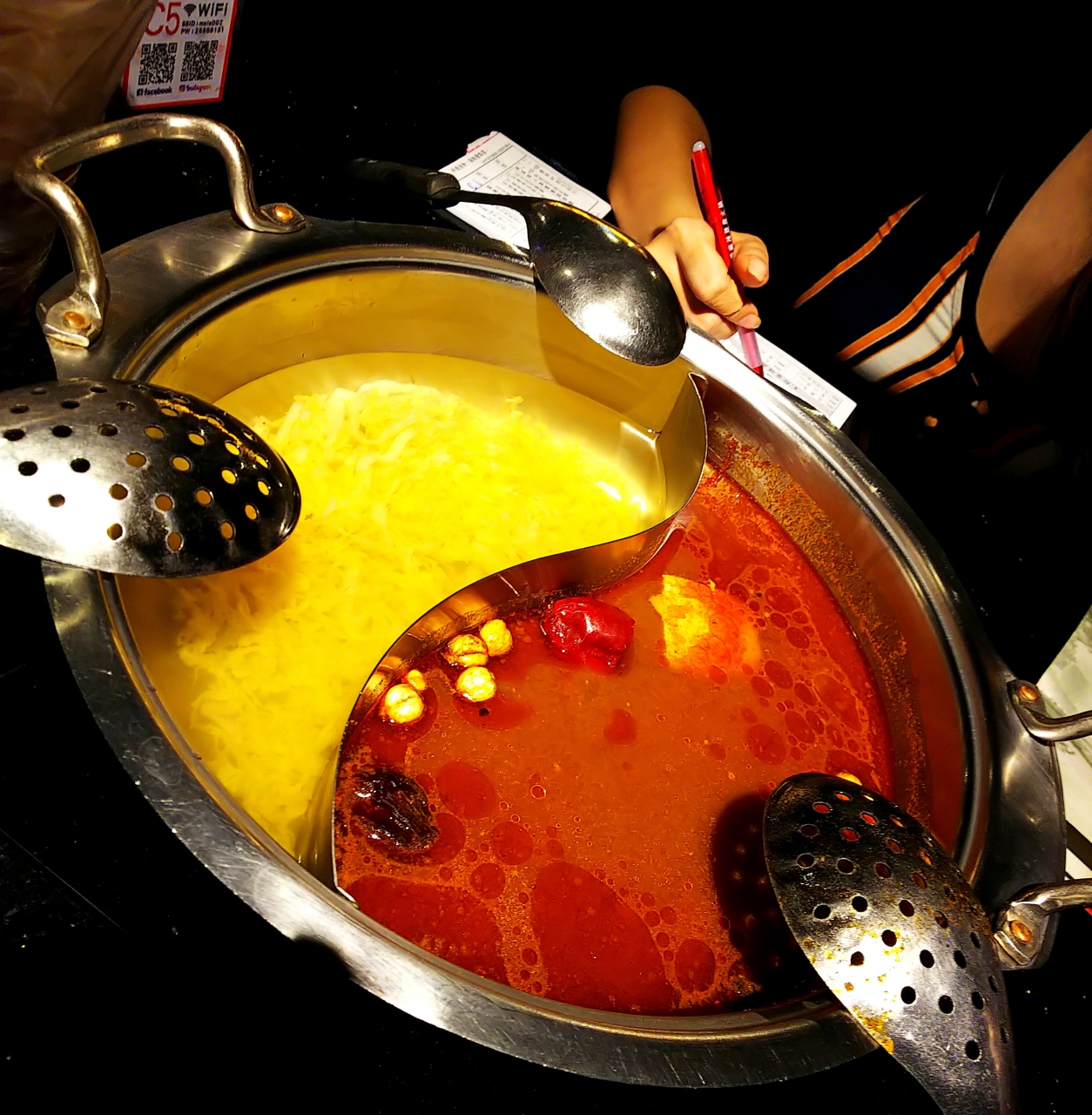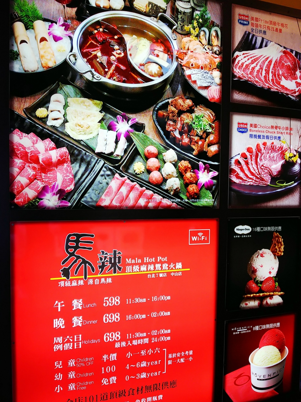 馬辣頂級麻辣鴛鴦火鍋 中山店は中山駅のすぐ側です。火鍋のスープは、白湯スープと麻辣スープがあらかじめセットされていした。ここのお店は、時間制の食べ放題。制限時間は平日or休日・ランチorディナー等によって90分~120分指定になります。野菜、魚介、お肉などのメインどころは、写真付きのメニューを見てオーダーする方式。ドリンク類・フルーツデザート・アイスはバイキング方式です。麻辣味は見た目ほど辛くなく 花椒が苦手(舌がしびれて味が感じられなくなる)な私でも美味しくいただけました♪(^o^)