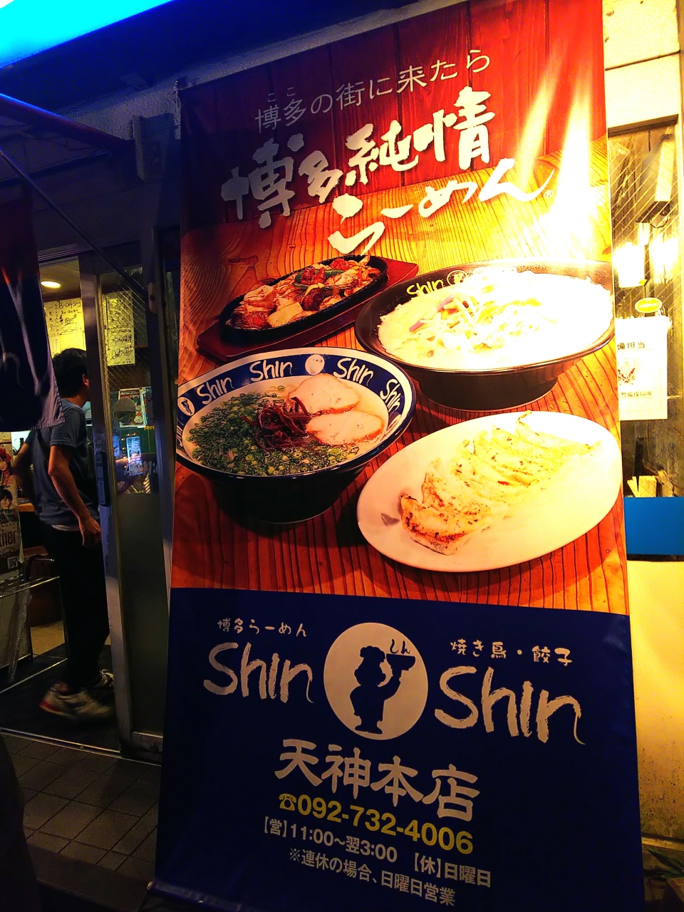 ご当地「豚骨ラーメン」の人気店、ShinShin天神本店。ここは、天神駅からも宿泊先ホテルからも徒歩5分とかからないご近所。昼に覗いたときには、長蛇の列にびっくり! 夜7時半に再訪したときには、タイミングが良かったようで5人ほどしか並んでおらず、10分程で店内に案内されました。