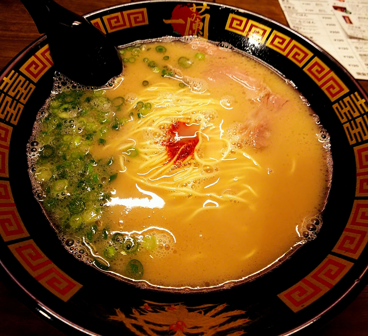 博多の駅ビルをブラブラしていていたら、「一蘭」発見!東京にもありますが、今まで入った事はありませんでした。なんといっても、博多・長浜発祥の有名店ですから、ここで入らずいつ行くの?今でしょ!?♪って事で、突撃ー!(^o^)独特な注文方法(まず、食券を買う列に並び、食券を買ったら、今度は店内に入るための別の列に並ぶ)にちょっと面食らいましたが、あまり混んでいなかったので、待ち時間は5分ほどでした。