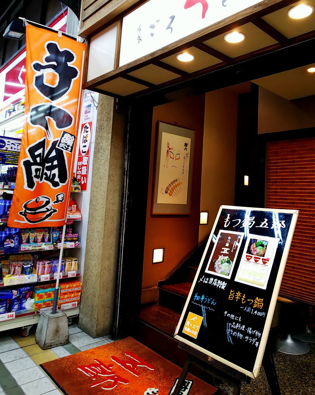 ちょっと気になっていた「もつ鍋五郎」さんは、西鉄天神駅近くアーケード街の中にあります。お店は、階段を上がった2階です。店内はスッキリしてますが、アメフトのユニフォームが飾ってありました。あとで調べたら、ご主人アメフトの有名人らしいです。