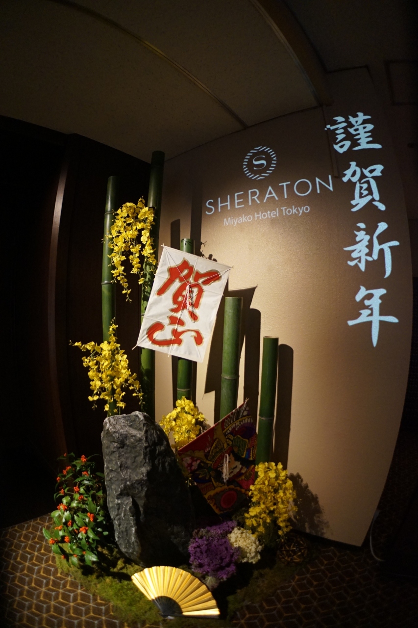 目黒駅からホテルの無料シャトルバスが出ています。バスの車体に、ロゴマークがあるので、初めてでも迷わないでしょう。シェラトン系列のホテルですが、都という名前がついているように、どことなく日本らしい雰囲気もありました。年末に行ったので、お神酒が正面ロビーの所に飾られていました。
