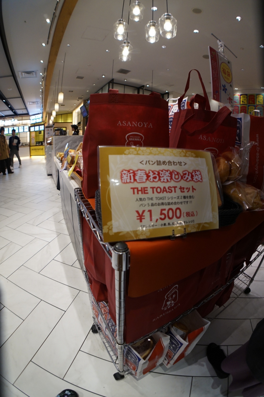 オープンタイプのパン屋の前で、お正月の風物詩である、福袋が売られていました。中身は、見えるようになっており、買う人のことが考えられているな、と感じました。