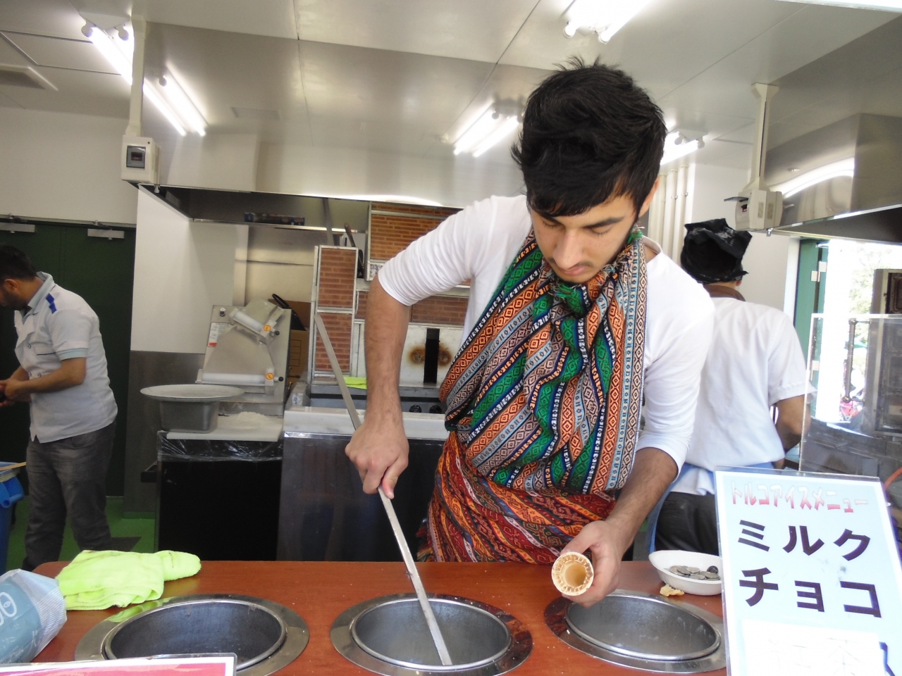 私は「トルコ」の街がオープンしたばかりの時に行きましたが、超イケメンのお兄さんがのび~るアイスを作ってくれました。娘のアイスを渡す時はパフォーマンスを見せてくれて 思わず笑顔に。アイスのお味は最高でした。