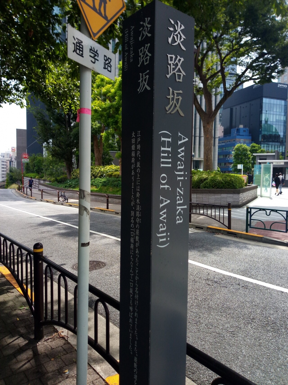 御茶ノ水駅前から神田・秋葉原方面に向かう途中にある坂道が淡路坂です。江戸時代、坂の上に鈴木淡路守の屋敷があったことから、この名前が付いたそうです。坂道沿いにはビジネスホテルや飲食店などはありましたが、特に、これと言った特徴がある坂道ではなかったです。