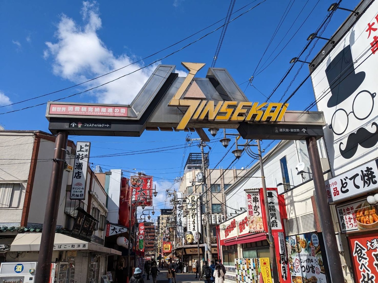 大阪メトロ御堂筋線「動物園前駅」から歩いて約5分 、ディープな大阪の雰囲気を堪能することができる街が「新世界」です。大阪のシンボルでもある「通天閣」を中心とした街には、たこ焼きや串カツなど大阪グルメを楽しむことができるお店が並んでいますが、どのお店も派手な店構えなので、街中散策しているだけでも楽しむことができました。