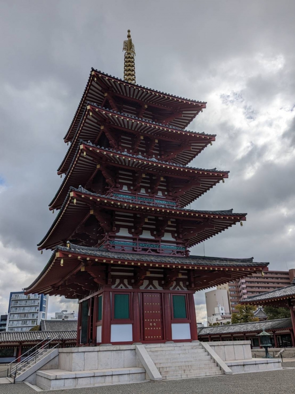 JR天王寺駅から歩いて10分位のところに「四天王寺」はありました。聖徳太子により1400年以上前の593年(推古天皇元年)に建立された日本仏法最初の官寺としても有名です。広い境内には、五重塔など見どころがたくさんありました、また、大師会 (縁日)が開催されている日だったので、たくさんの露店が出店しており、参拝者で賑わっていました。