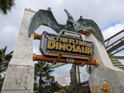 映画「ジャラシックパーク」で登場する恐竜「プテラノドン」に背中を掴まれ、全身むき出しの状 態で空を飛んでいる感じをイメージしたジャットコースターです。高低差も凄かったですが、360度振り回されるので、重力加速度 (G)をたっぷりと感じることができました。