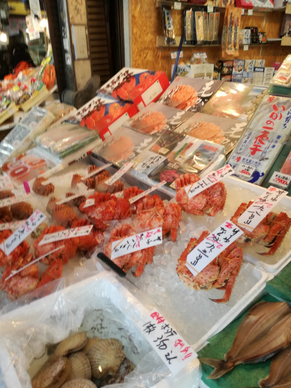 大通公園とすすきのの間、ちょうど狸小路を抜けたところにある市場です。たらば蟹、花咲蟹、毛蟹などをはじめ、ウニ、イクラ、ホッケなどの魚介類を売っているお店が並んでいました。たらば蟹も美味しそうでしたが、特に、ホッケはサイズが特大な割りに値段が安くおみやげにもおすすめです。