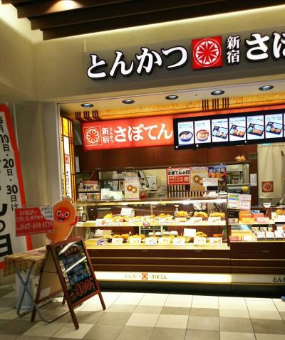 ららぽーとTOKYO-BAYにある「とんかつ新宿さぼてん」です。とんかつなど揚げ物のテイクアウト専門店なので、ららぽーとでショッピングをした帰りに立ち寄って買って帰ることができます。とんかつ、コロッケ、海老フライなど値段はサクサクで美味しいです。