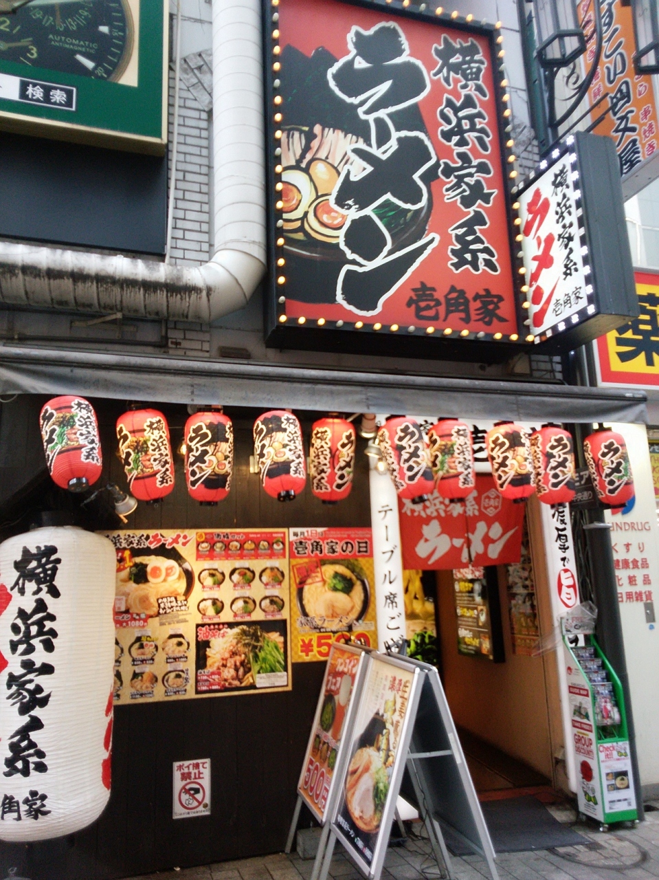 新宿駅(東口)から徒歩数分、アルタの裏通り沿いにある横浜家系ラーメン(壱角家)です。この通り沿いや周辺にはたくさんのラーメン屋さんがある激戦地ですが、その中でも美味しいラーメンを食べることができるお店です。濃厚なとんこつベースのラーメンは醤油味と塩味がありましたが、どちらも美味しいのでオススメです。