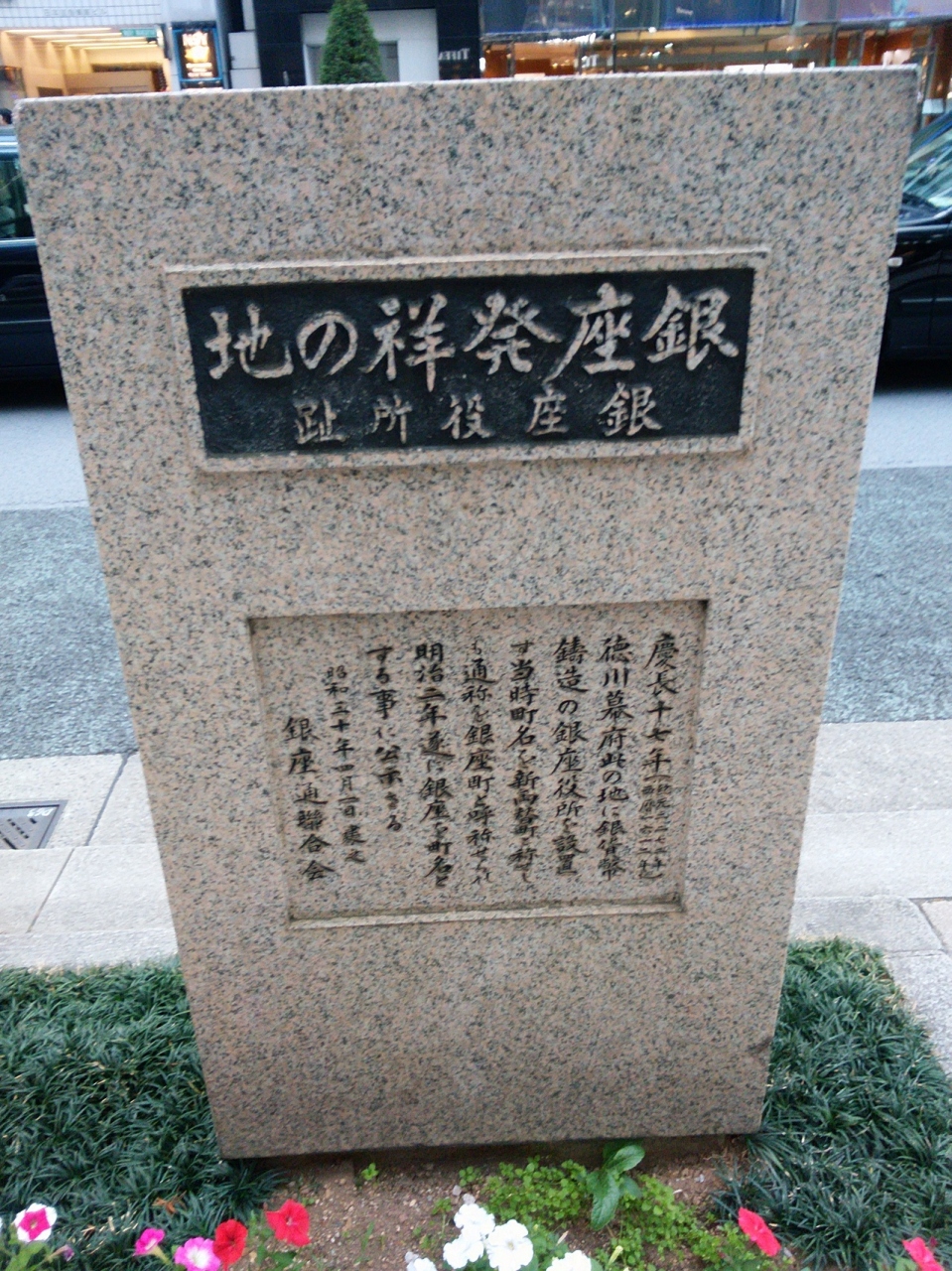 銀座中央通り沿いのティファニー銀座ビルの前に銀座発祥の地の碑はありました。石碑には、銀座という地名は江戸幕府が銀貨鋳造所を駿府城下からこの地に移したことに由来する旨が刻まれていました。それほど大きくもなく、特徴もない石碑なので注意していないと素通りしてしまうようなものでしたが、銀座を知る上では興味深いものでした。