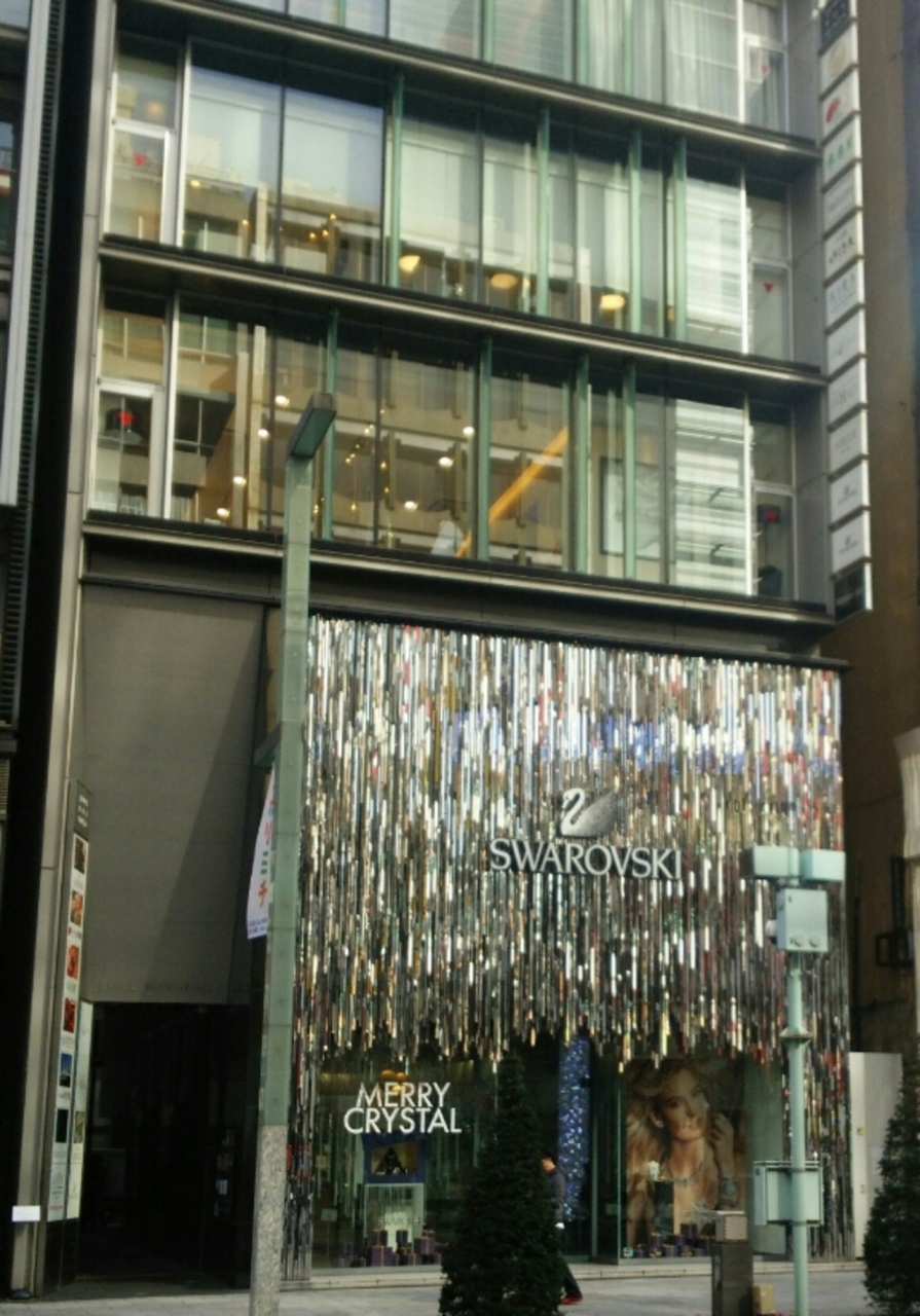 銀座中央通り沿いにあるスワロフスキーのショップです。この通りにはたくさんの高級ブランドショップがありますが、このお店の外観は、クリスタルで装飾されていて、キラキラしており存在感がありました。