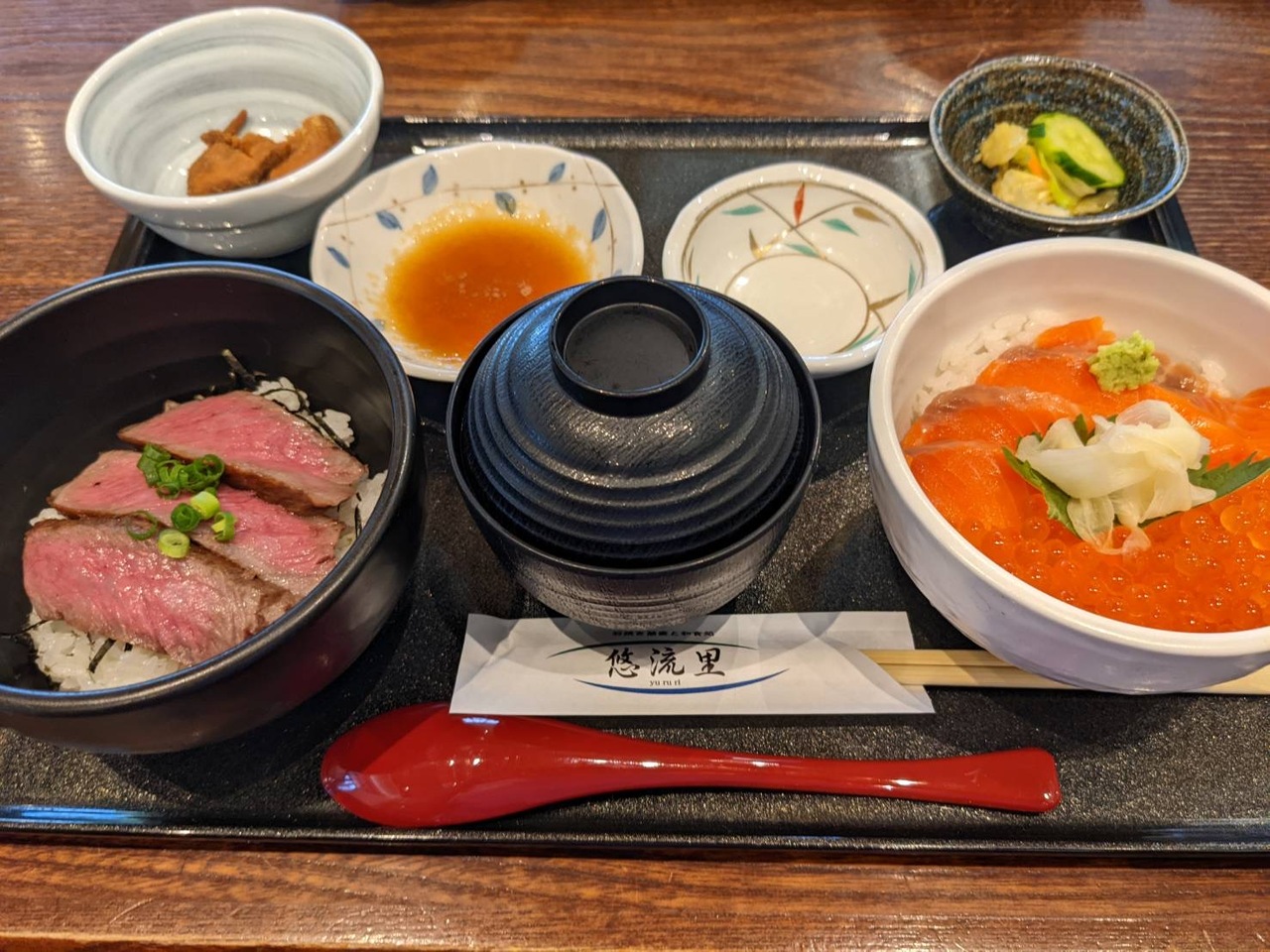 JR村上駅から車で5分位のところにある石挽蕎麦と和食の食事処です。ランチで利用しましたが、人気店のようで店内はかなり混雑していました。村上名物の鮭とはらこ(イクラ)が乗った鮭親子丼と村上牛炙り丼のセットを食べましたが、どちらの丼ぶりも美味しかったです。