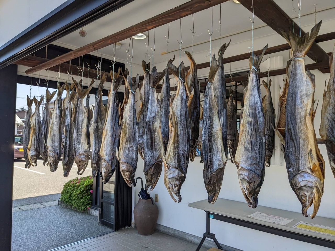 JR村上駅から車で5分位のところにある村上名物の鮭の加工食品を買うことができるお店です。お店の前にはたくさんの鮭が干されていました。鮭の酒びたしやはらこ(イクラ)の醤油漬けなどはおみやげにも最適です。隣りにある悠流里(食事処)のレシートがあれば、5%割引になります。