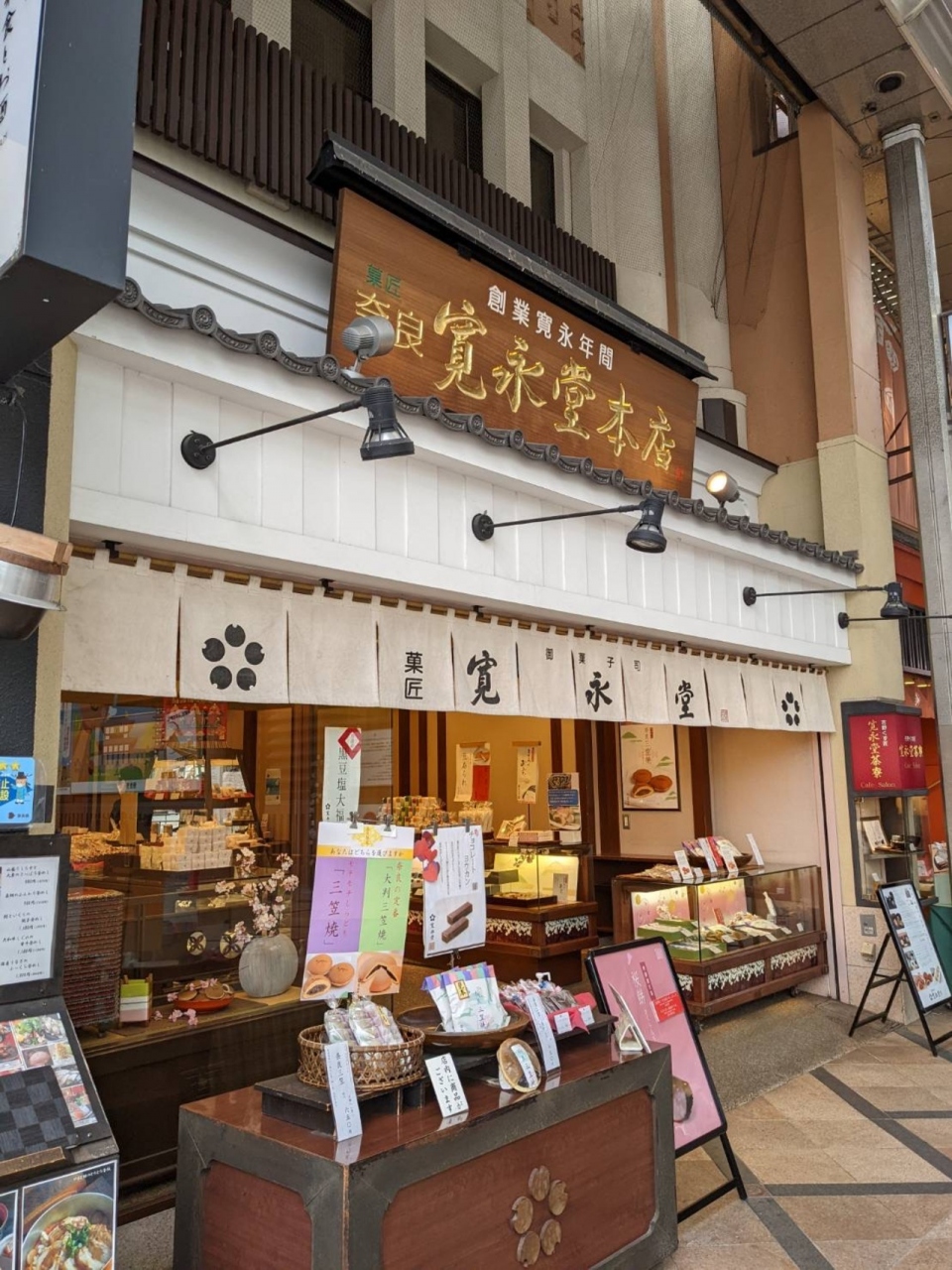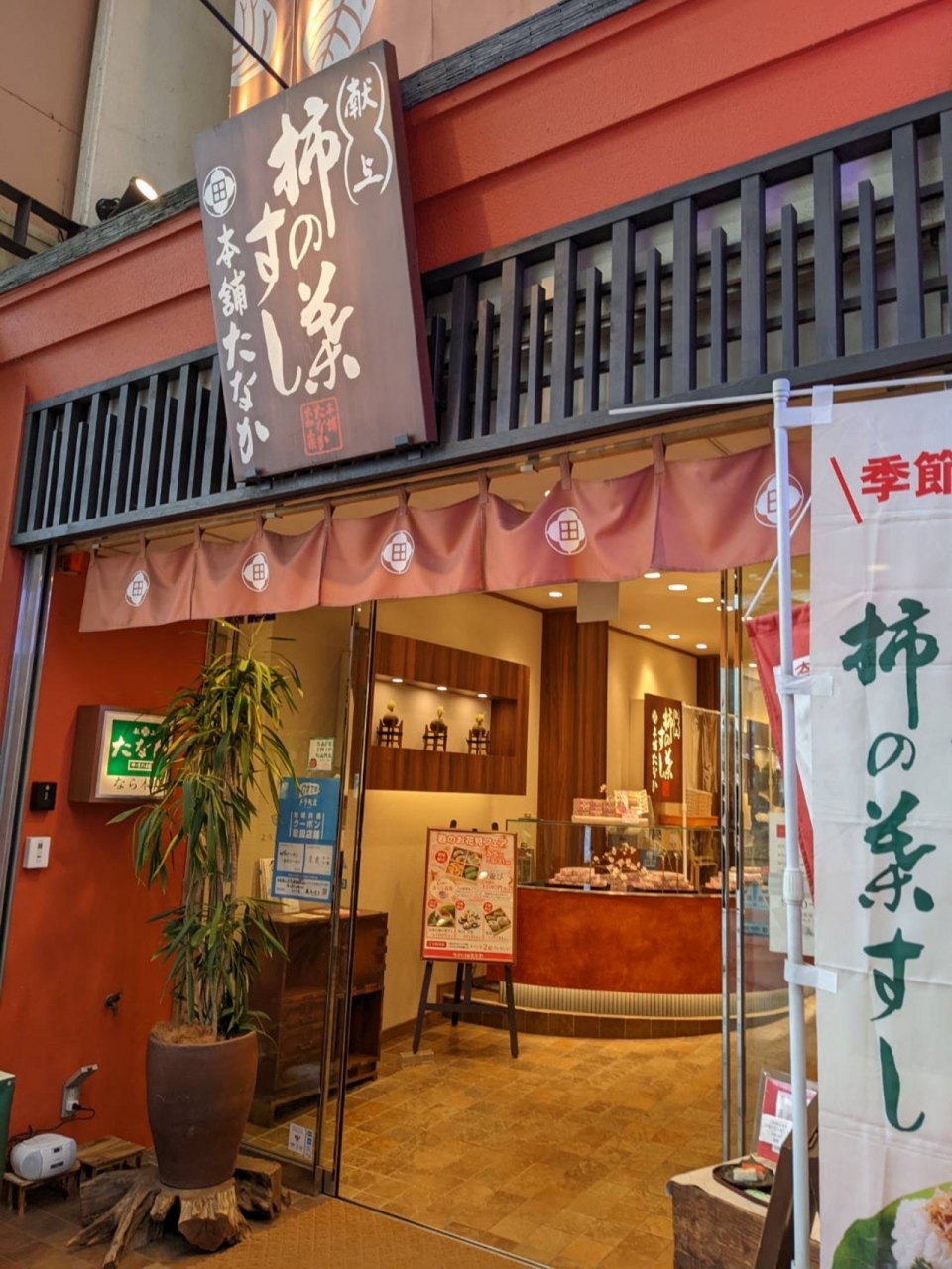 近鉄奈良駅から直ぐ、東向き商店街の入口付近にありました。奈良名物の「柿の葉寿司」の老舗店です。柿の葉寿司は、鯖や鮭などの切り身が乗った酢飯を柿の葉で包んだ押し寿司で、あっさりとしていて食べやすく美味しかったです。奈良のおみやげとしてもおすすめです。