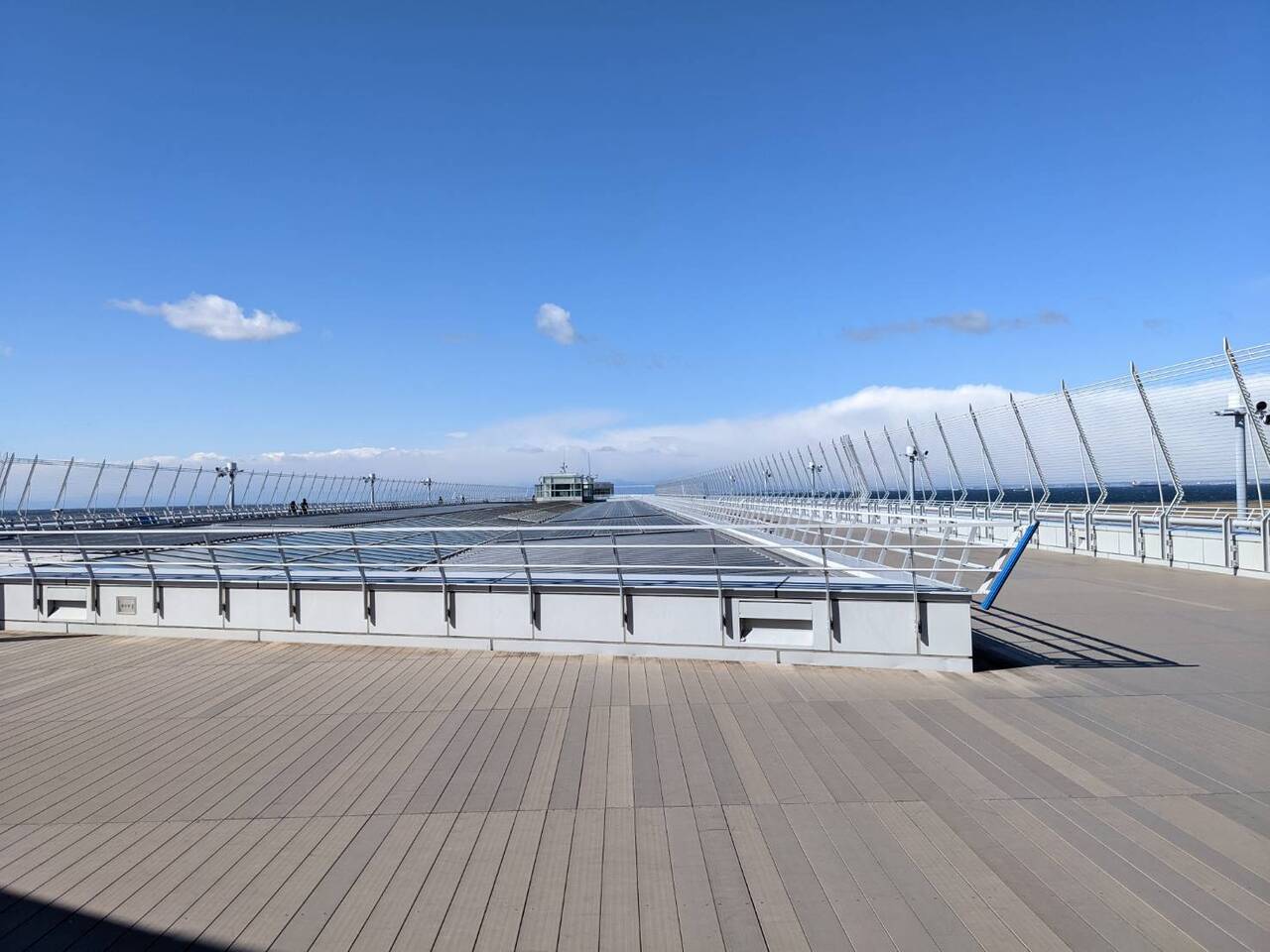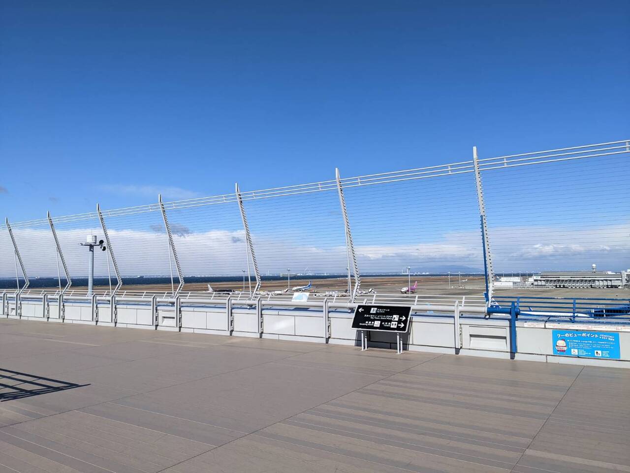 中部国際空港のスカイデッキは、滑走路に向かって、約300メートルの屋外デッキです。伊勢湾や対岸の三重県などを眺めながら、飛行機の離発着を見ることができるので、子どもから大人まで楽しむことができます。コロナ禍で離発着する飛行機が少ないのは残念でした。