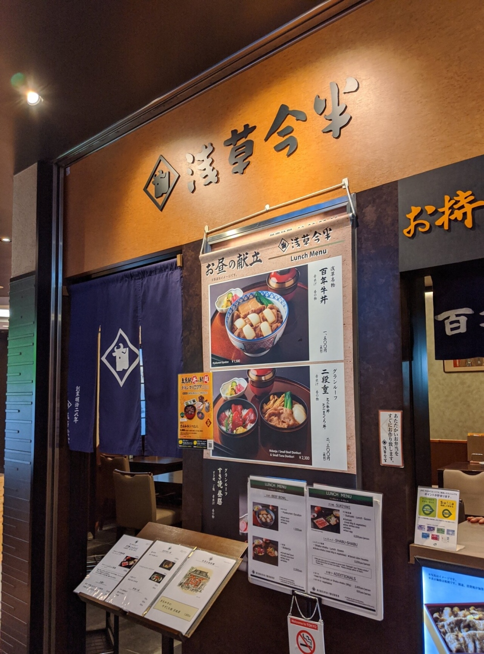 東京駅グランルーフ(東京駅直結)にある「浅草今半」です。老舗のすき焼き屋さんですが、ランチタイムなら比較的リーズナブルな値段で食事をすることができます。牛丼(1500円税別)を食べましたが、柔らかくて味の良く染みたお肉が美味しかったです。