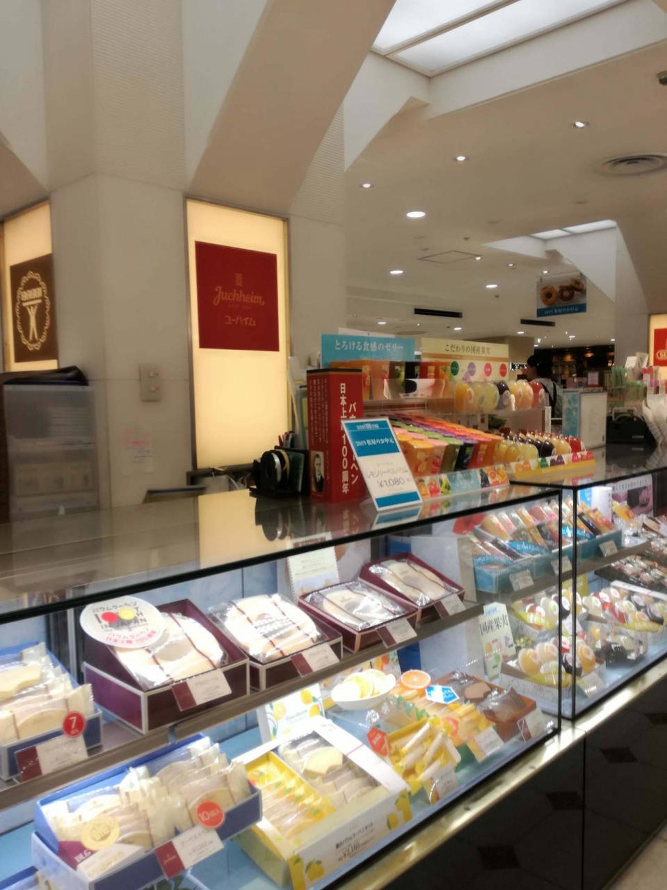 松屋銀座の地下食料品売り場にあるユーハイムです。デパ地下では、定番の洋菓子店です。焼き菓子、ゼリーなど品揃えは充実していますが、その中でもしっとりとした口当たりで柔らかい「バウムクーヘン」は美味しいので、おみやげに買って帰るならお勧めです。
