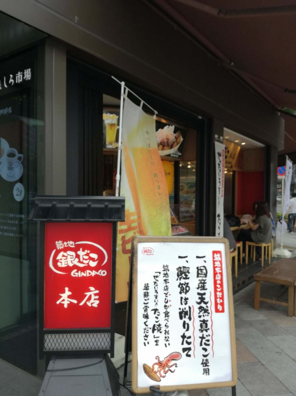 築地場外市場前、晴海通りと新大橋通りが交差する交差点の一角にある築地銀だこの本店です。場所柄、たくさんの外国人観光客の人たちがたこ焼きを食べていたのが印象的でした。外側はカリカリで中身はトロトロ、ジューシーな焼きたてのたこ焼きは美味しかったです。