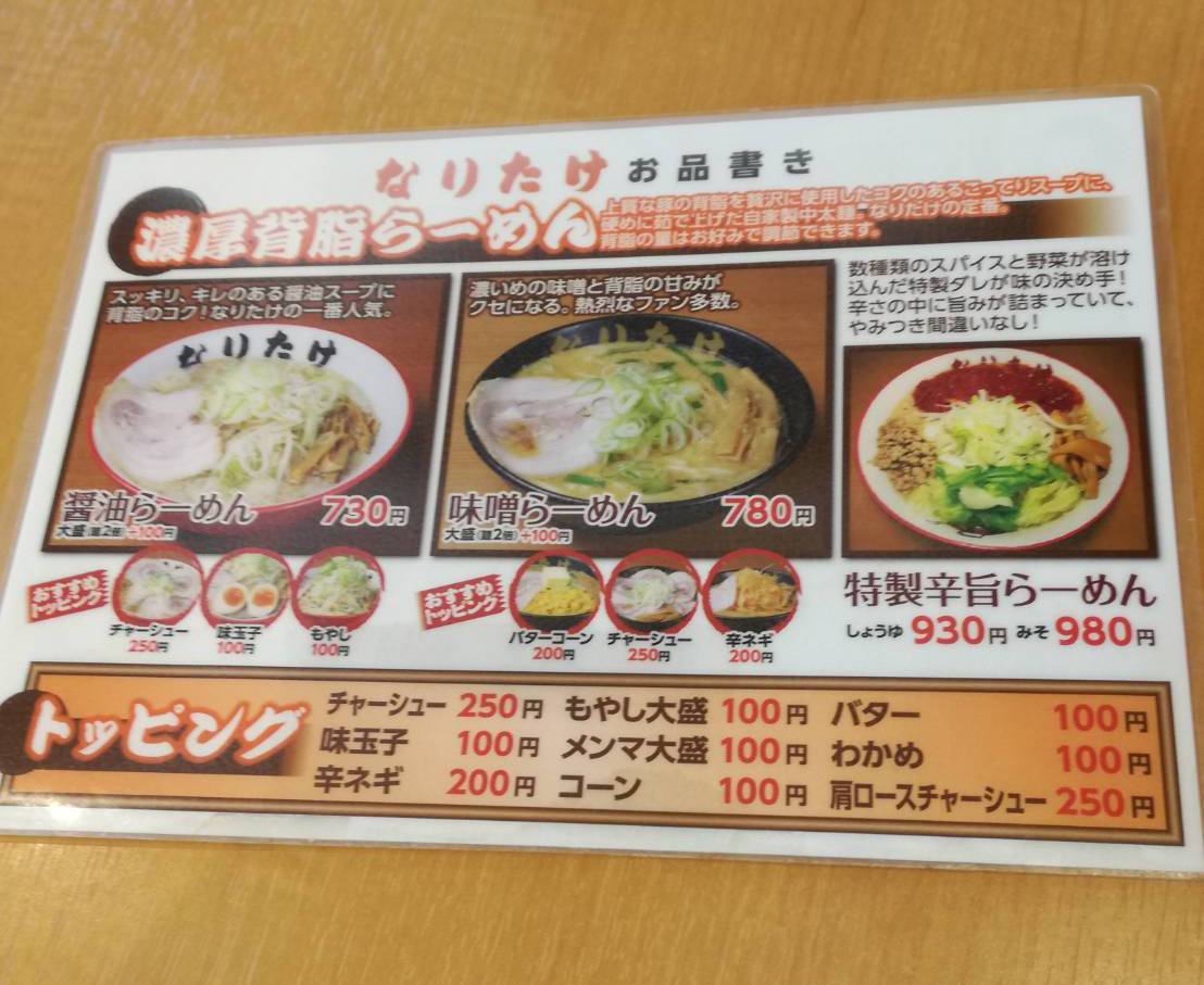 武石インター(京葉道)から直ぐのところにある「なりたけ」です。醤油ラーメンを食べましたが、背脂がたっぷりと浮いた濃厚でコテコテなスープと中太麺。食べ始めは美味しかったですが、こってりし過ぎて途中からキツくなりました。人気店なので店内は混雑していましたが、個人的には一度食べれば満足のラーメンでした。