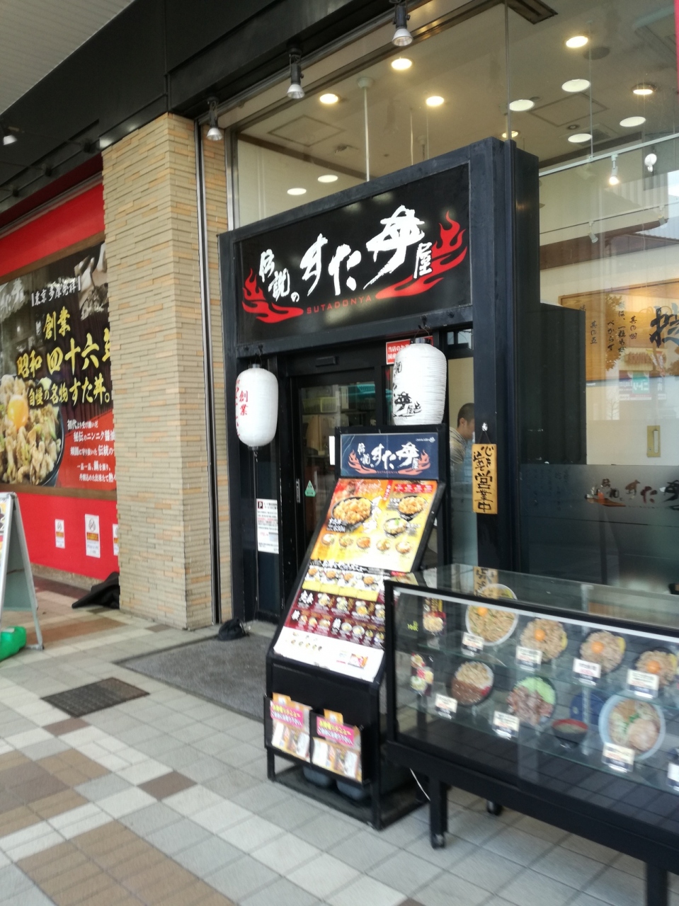 JR津田沼駅から新京成津田沼駅に向かう途中の商業施設(ミーナ津田沼)にあるお店です。ニンニクたっぷりの醤油ダレで炒められた豚肉が乗った「スタ丼」はお手頃な値段にもかかわらず、ボリュームがあって、美味しいのでおすすめです。