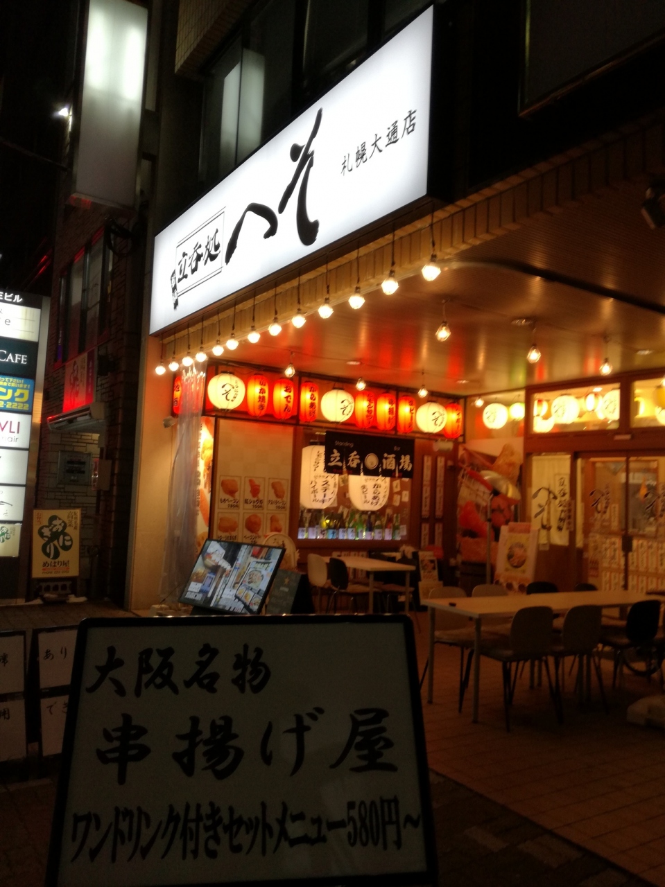 大通公園から徒歩数分と立地の良い場所にある立ち飲みの居酒屋です。立ち飲みには抵抗感がありましたが、実際に行ってみると意外に良かったです。串揚げ、から揚げなどの居酒屋料理も低価格で、更に、美味しかったです。気軽に利用することはできますが、短時間での利用がおすすめです。