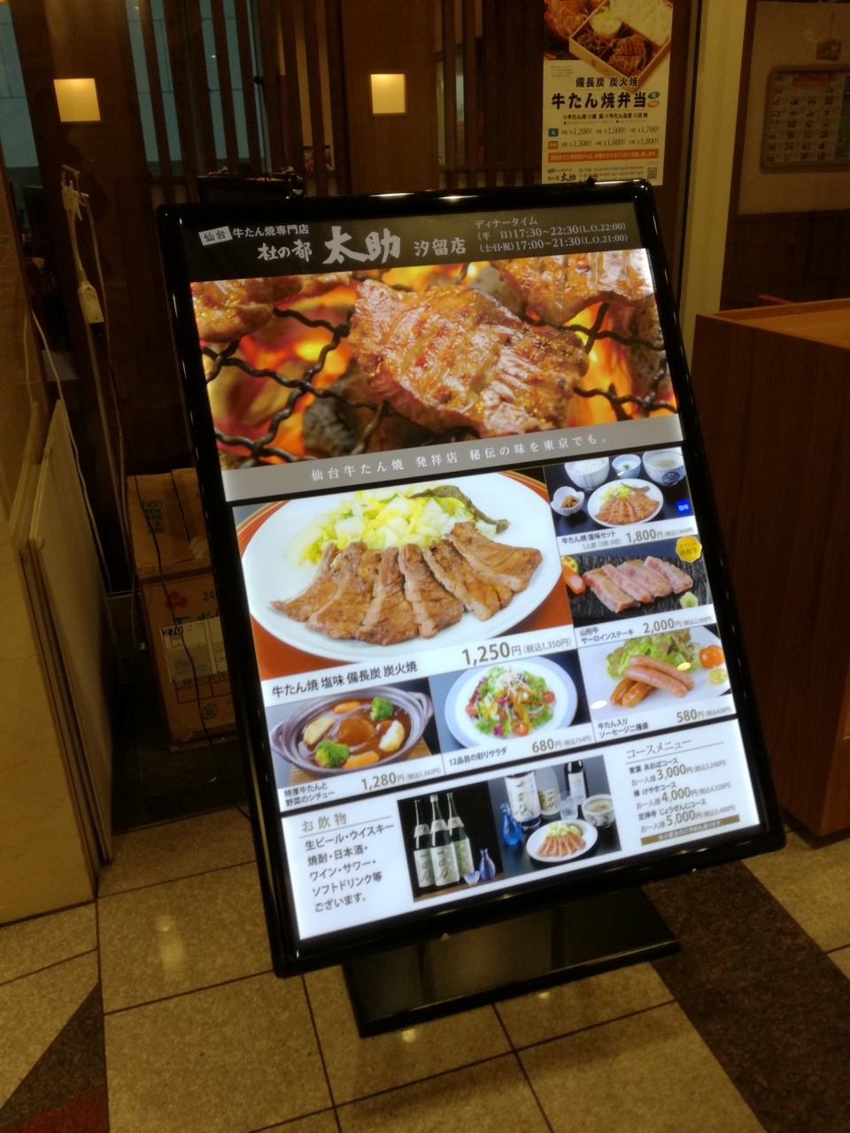 新橋駅から徒歩5分程、汐留シティセンターのレストラン街にあるお店です。仙台でも有名な牛タンのお店のようで、炭火で焼いた牛タン焼きや良く煮込まれた牛タンシチューなどを食べることができます。牛タン焼きは、肉厚な牛タンで、香ばしく美味しかったです。