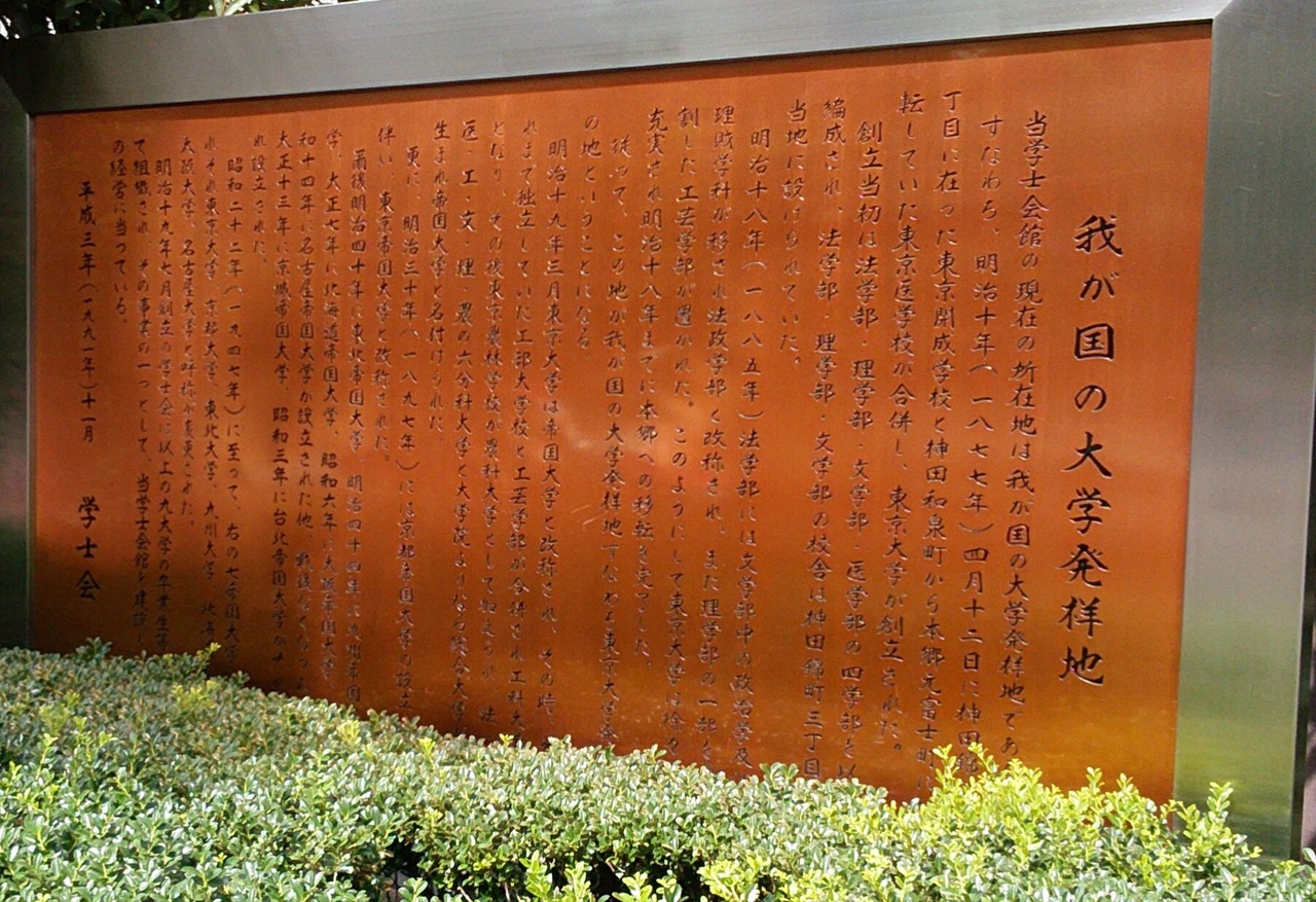 学士会館の脇に「我が国の大学発祥地(東京大学発祥の地)」の記念碑はありました。どちらの記念碑も特に、特徴があるものではなかったです。東京大学と言えば、赤門や安田講堂など有名な歴史的建造物がある本郷キャンパスをイメージしますが、元々はこの場所が発祥の地であることを知り驚きました。