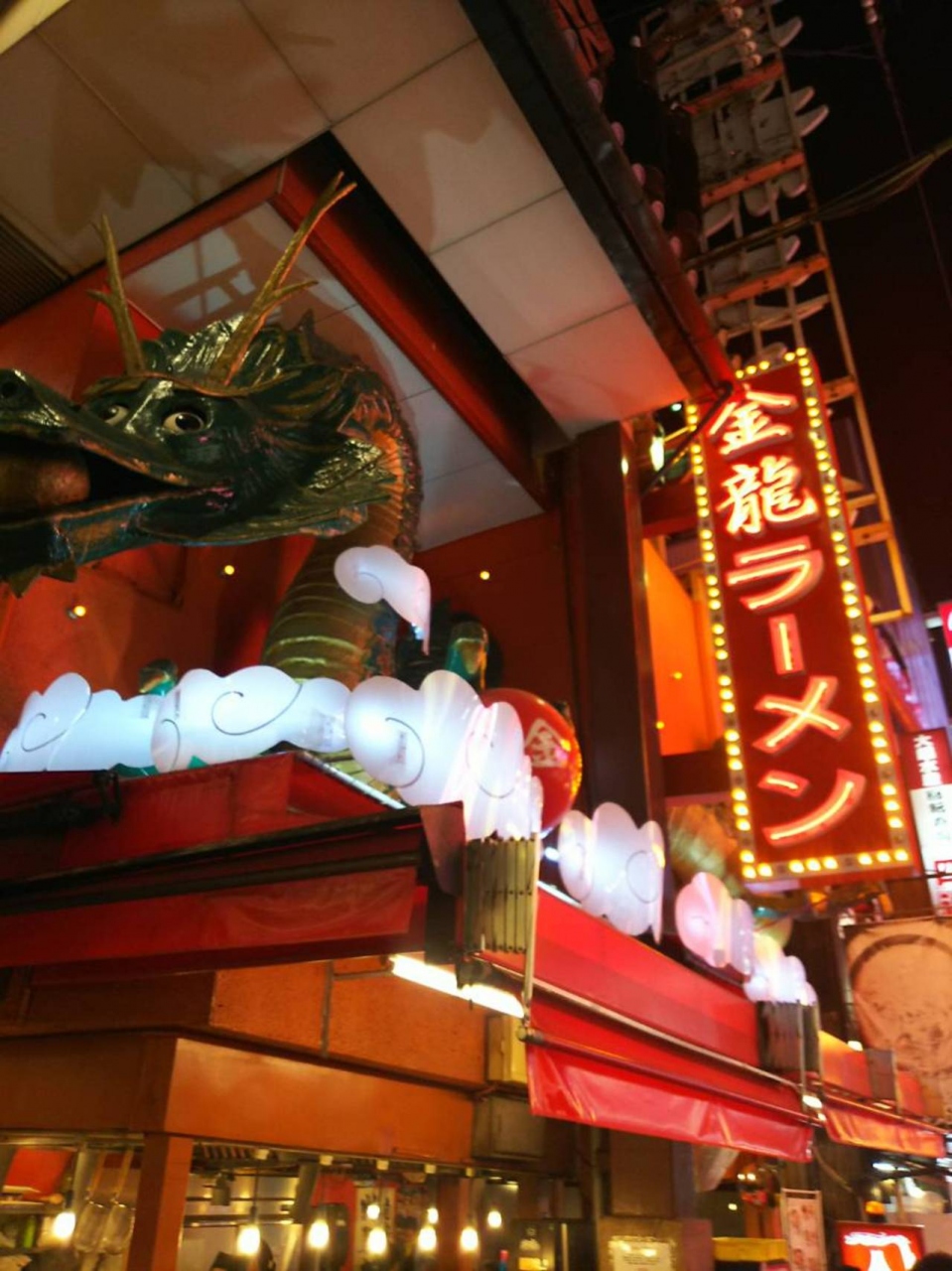 金龍ラーメンは、くいだおれの街「道頓堀」にあります。24時間営業の人気のラーメン店で、インパクトのある大きな龍のオブジェが目印です。外国人観光客の人たちも多く、いつ行っても混雑しています。ラーメンは、あっさりしていて美味しいです。
