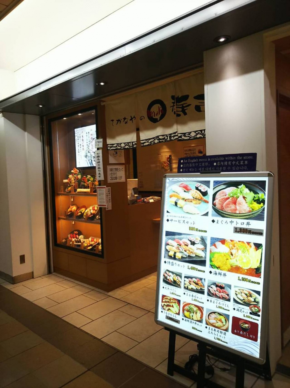 新大阪駅構内の商業施設(アルデ新大阪)にあるお寿司屋さんです。お手頃な値段でお寿司を食べることができます。サービスセット(赤だし付き)なら、1000円程度で食べることができます。魚屋さんがやっているお寿司さんらしく、新鮮なネタを提供してくれるので、新大阪でお寿司を食べるならおすすめです。