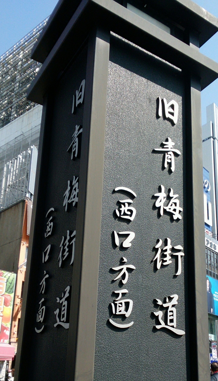 新宿駅東口と西口を結ぶ大ガード下の歩行者用トンネルの入口附近にひっそりと立つ標識です。「旧青海街道」と書かれた標識は古風なデザインで風情がある標識でしたが、アルタ前の交差点脇ということもあり、人通りが多くゆっくりと見るといった感じではなかったです。ちなみにトンネルを越えたところにも同様の標識がありました。