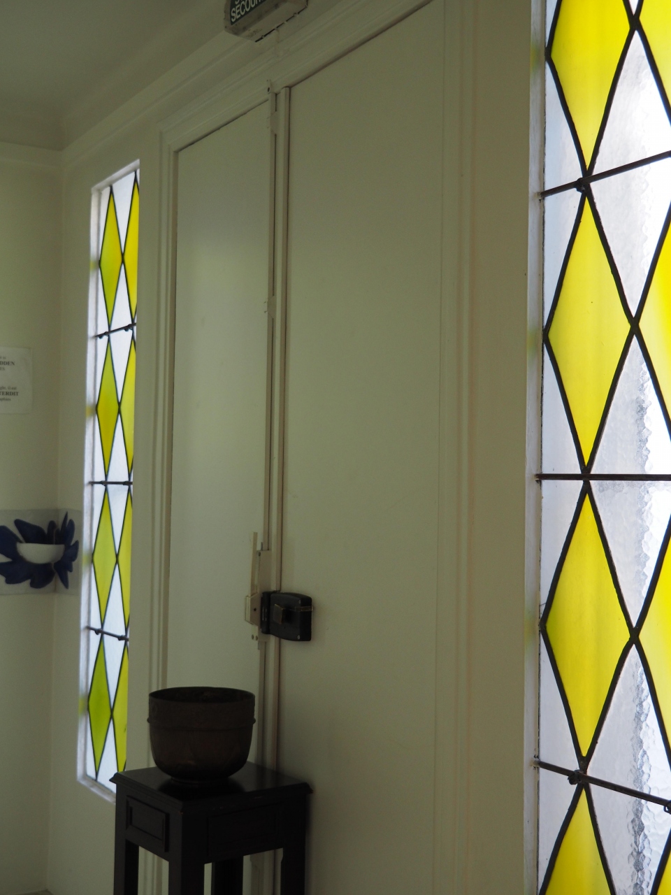 切り紙絵をもとに作られた鮮やかな色彩のステンドグラスが光が差し込む窓にはめ込まれ、色と光に包まれた空間を演出。白いタイルの壁に黒い線で描かれた聖ドミニクや聖母。線と色彩、光が絶妙なバランスで響き合っています。来れて良かったと実感します。入場料は7ユーロでした。チャペルの中は撮影不可、チャペル内部以外、展示室のほうは撮影可でした。- 旅行時期