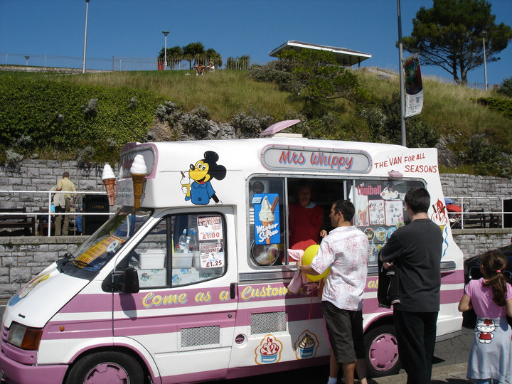ホーの丘(The Hoe)にある灯台(smeaton's tower)から海岸沿いの道に出て、古い街並みが残るバービカン(barbican)の方向へ向かうといくつかアイスクリームを売っているバンがある。そこで売られている「Today's special」というアイスクリームがおいしいです。